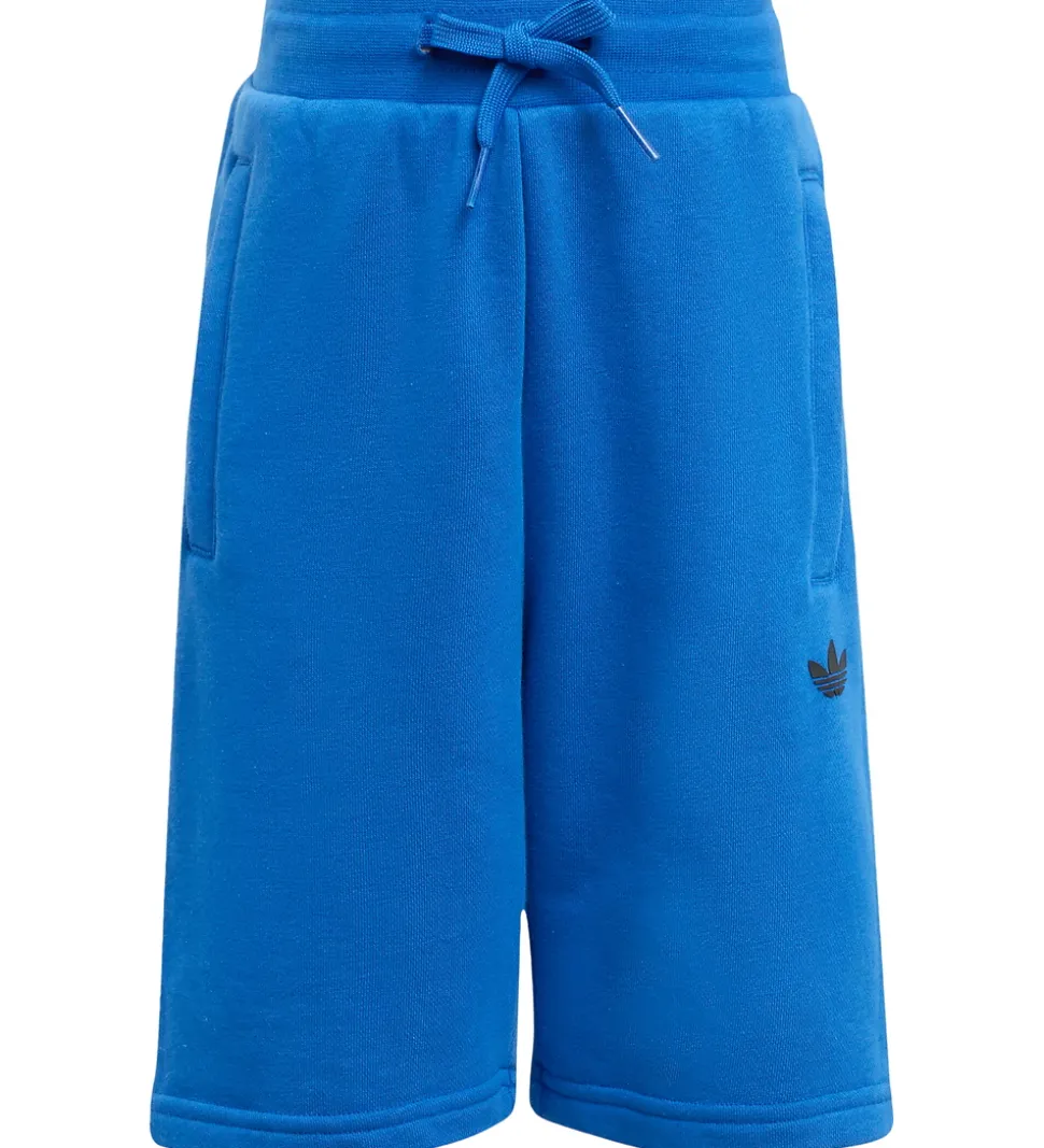 Nydelig adidas Originals shortssæt bestående af en t-shirt og et par sweatshorts i en klar blå farve. Shortsene har et enkelt design med det ikoniske adidas logo på benet, og t-shirten har et stort, sort logoprint fortil i sort med hvid kontrast.