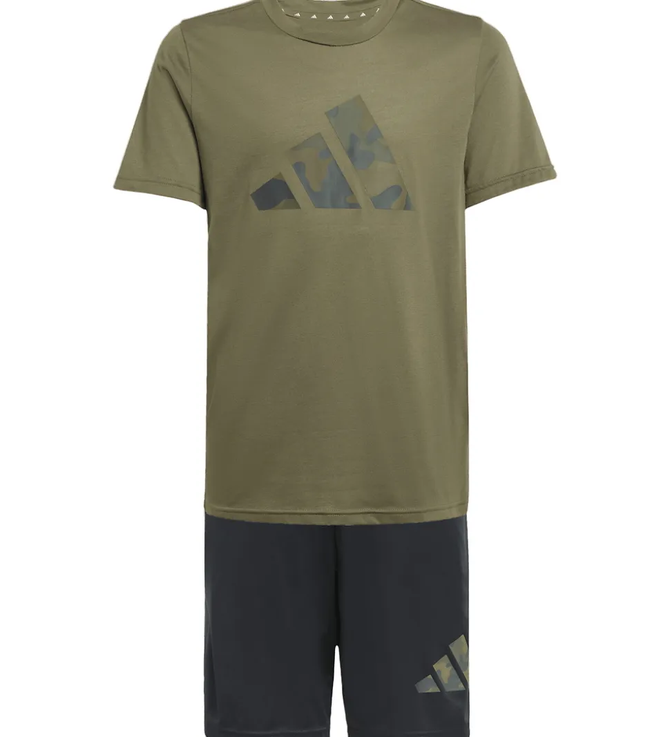 Stilrene adidas Performance shortssæt bestående af en t-shirt og et par shorts. T-shirten er olivengrøn med et grønt camouflage logoprint på fronten. Shortsene er sorte med et grønt camouflage logoprint på venstre lår.