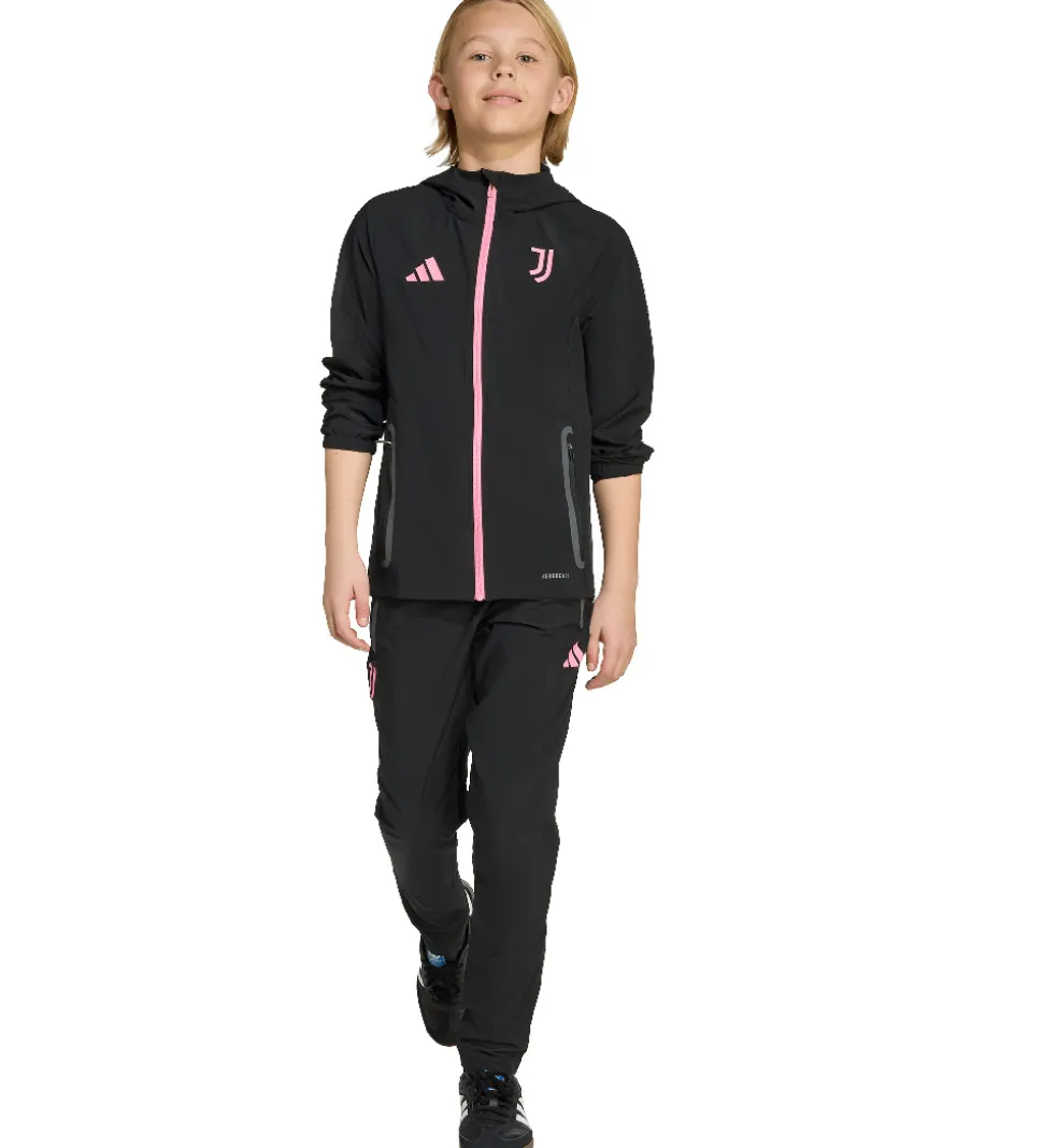 Flot adidas Performance træningsjakke i sort med rosa detaljer, og fortil i venstre side er der trykt et logo for den italienske fodboldklub Juventus.