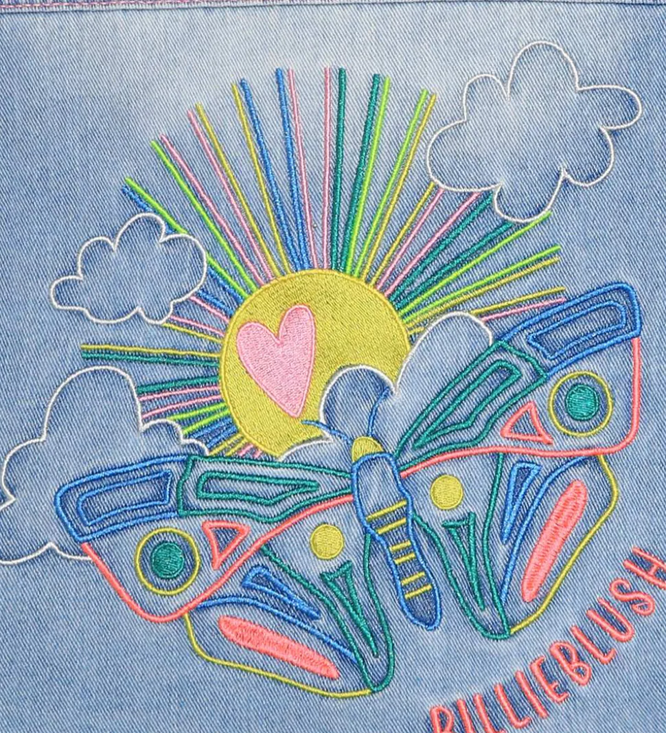 Sej Billieblush denimvest i blå denim med et let slidt look, rosa og grønne syningsdetaljer og flerfarvet trykknapper. På ryggen er der en stor, broderet sol, skuer og en sommerfugl i rosa, gul, blå og grøn, øverst er “Happiness” broderet i forskellige farver.