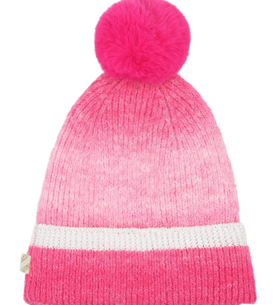 Imponerende Billieblush hue i en flot lyserød ombre-effekt, der går fra lys til mørk. Huen er fremstillet i en lækker, blød uldblanding. Billieblush huen er udstyret med en stor og blød pompom på toppen, der tilføjer ekstra charme. Den brede opsmøg har en glitrende badge med Billieblush logoet foran, hvilket giver huen et unikt udseende.