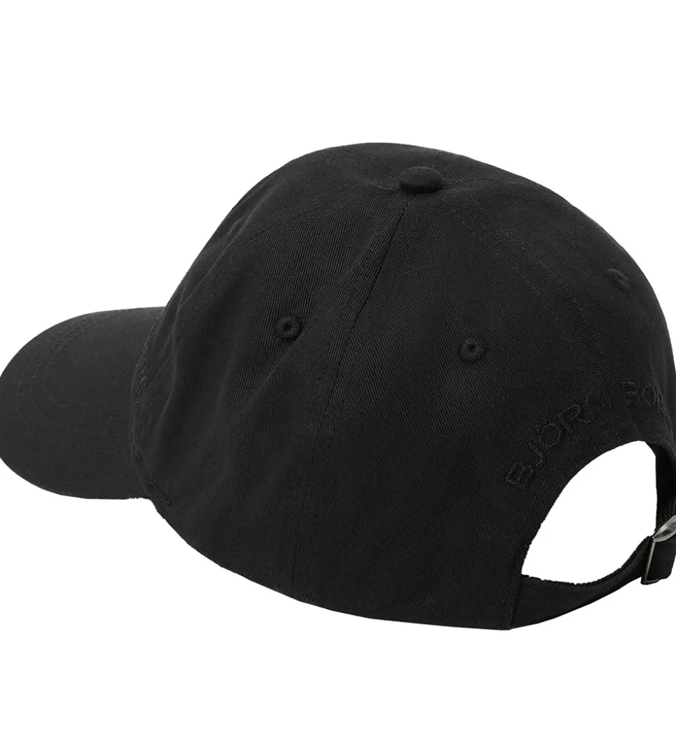Flot Björn Borg kasket i sort, og fortil til venstre står der “Borg” med småt, broderede bogstaver i beige. Logoet “Björn Borg” er også broderet i sort bagpå kasketten, lige over spænden.