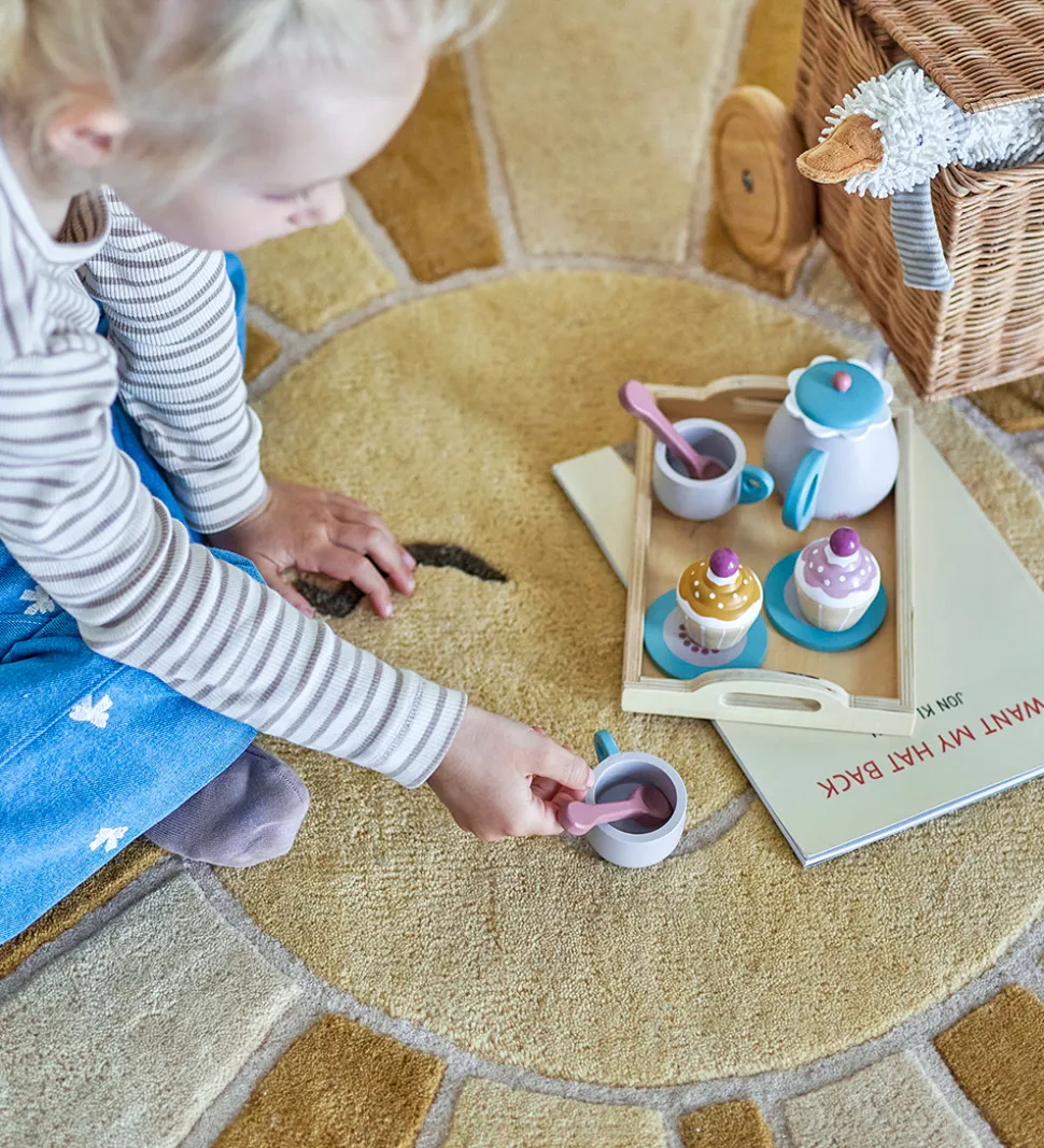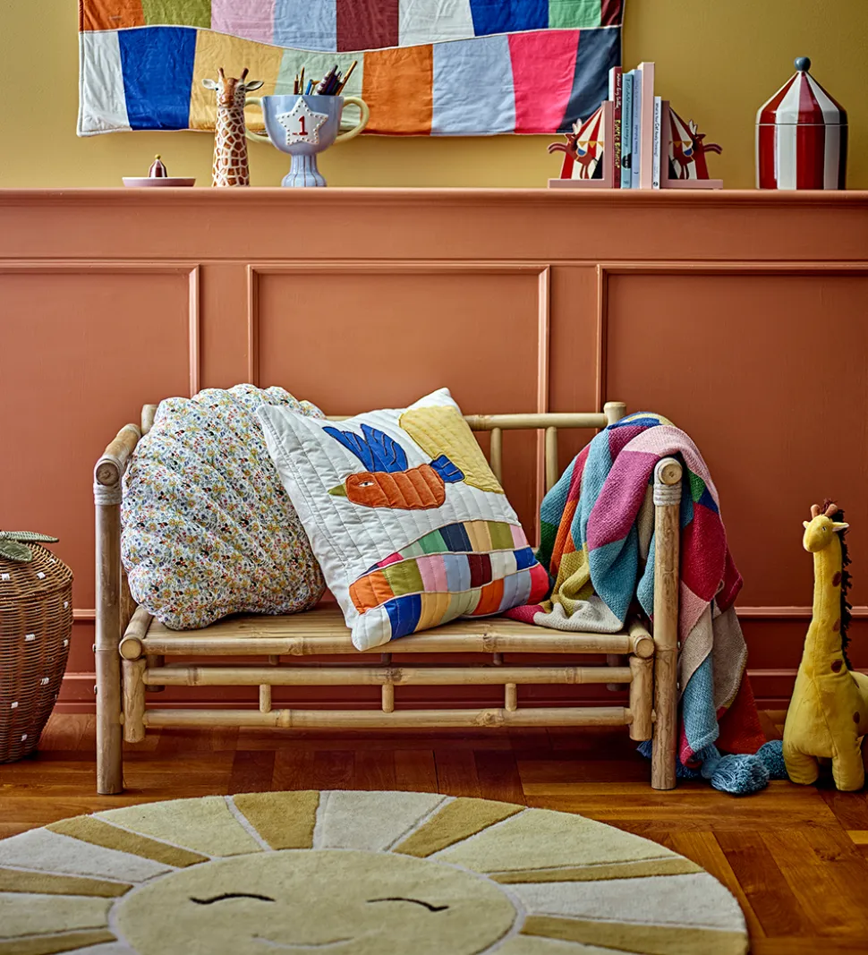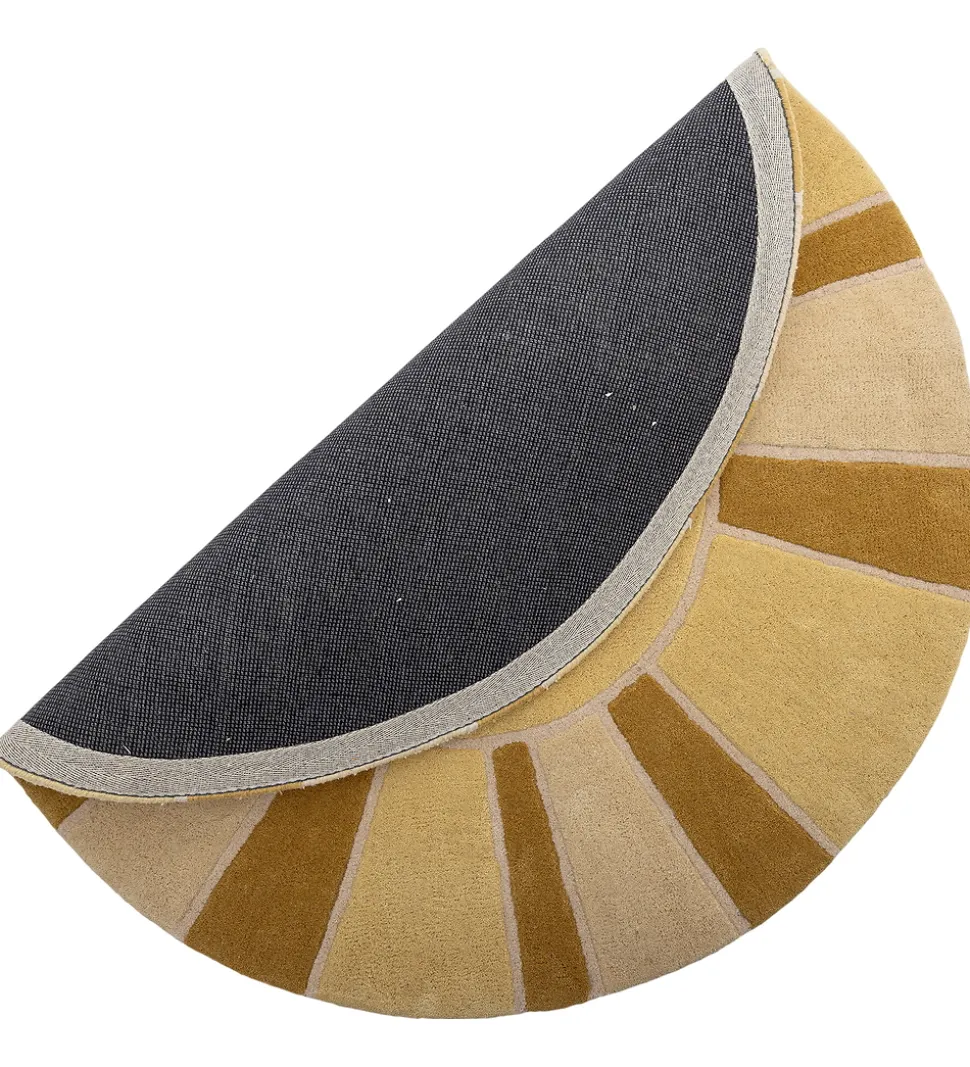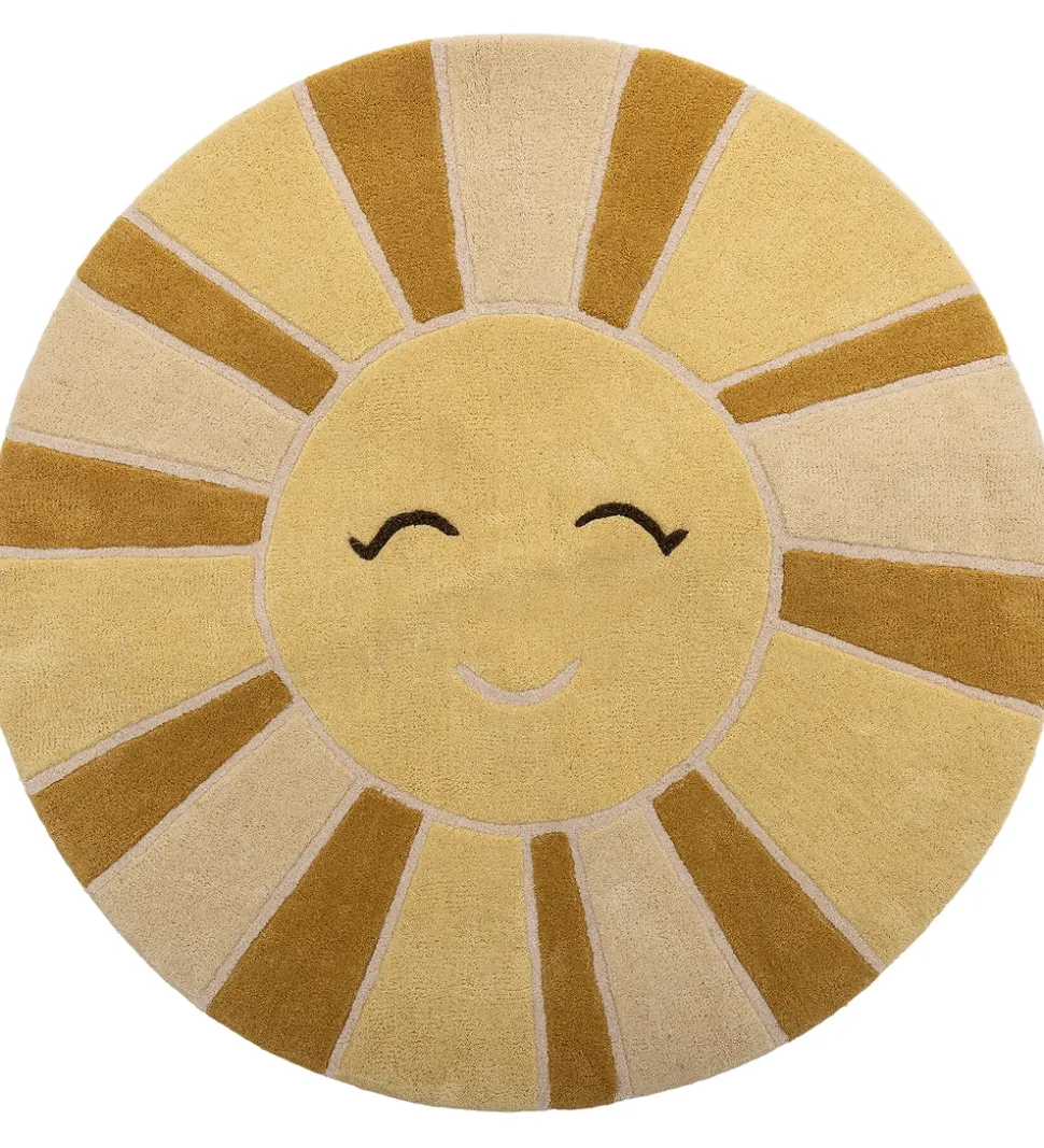 Charmerende Bloomingville gulvtæppe med et smilende solmotiv i varme gule nuancer. Dette runde design giver et frisk pust til ethvert rum. Bloomingville gulvtæppet er lavet af uld, så det både er flot og luner små fødder.