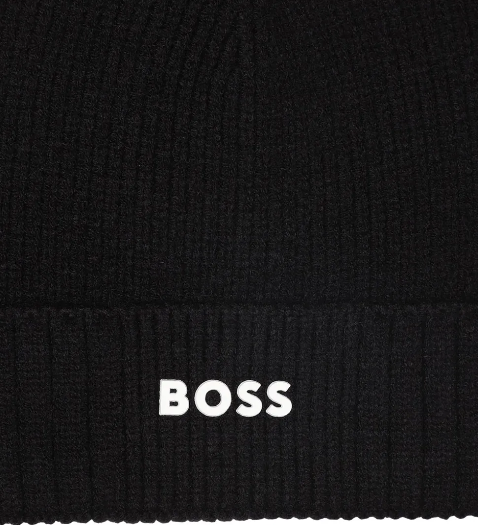 Lækker BOSS hue i sort i en blød, strikket kvalitet med ribstruktur langs kanten. Fortil står der “Boss” med hvide gummibogstaver.