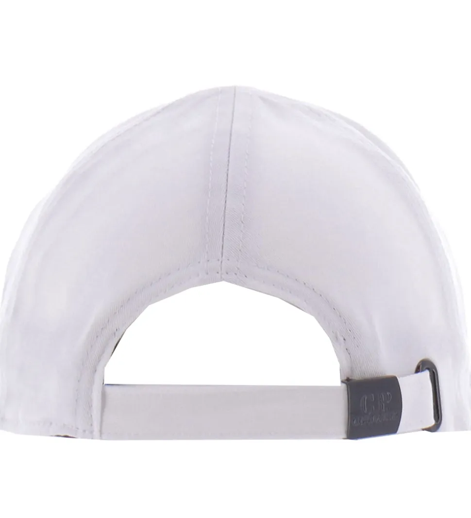 Fin C.P. Company kasket i ensfarvet hvid, og fortil står der “C. P. Company” med en kraftig brodering.