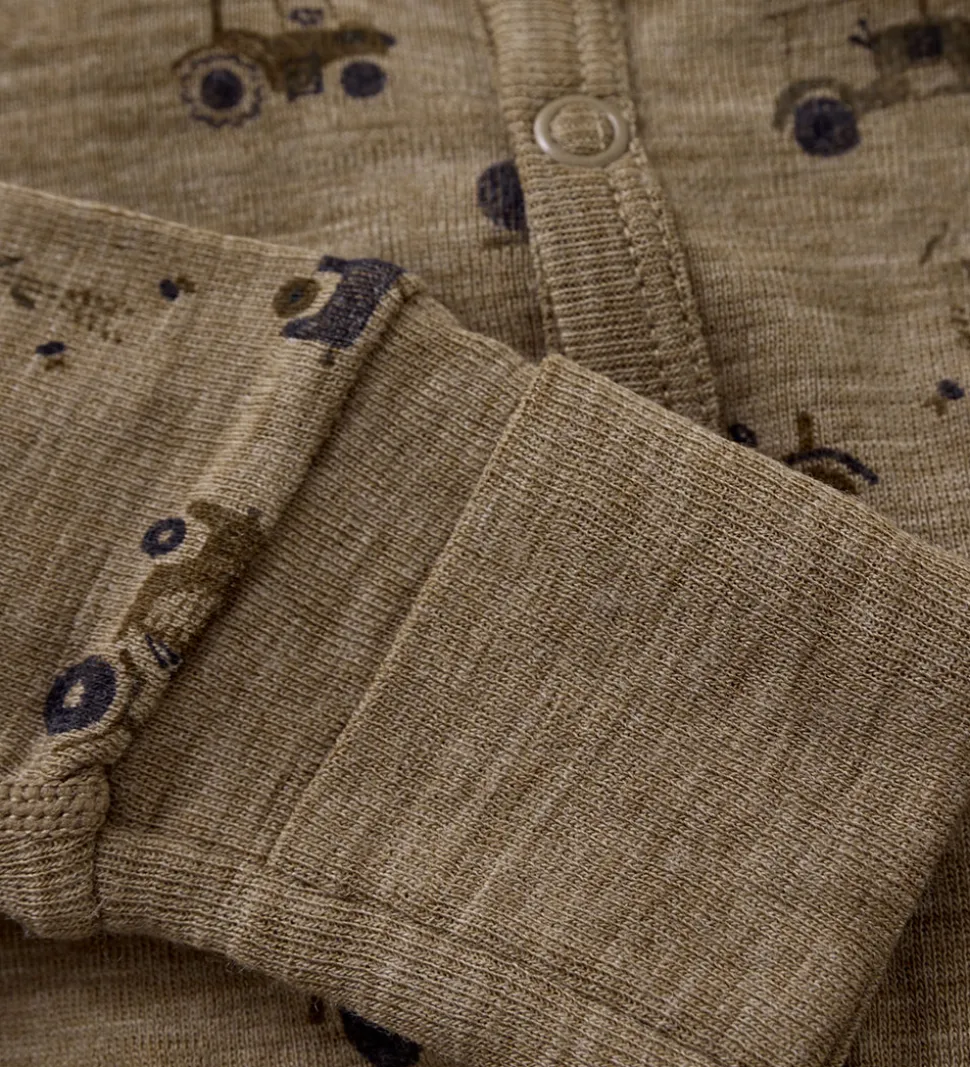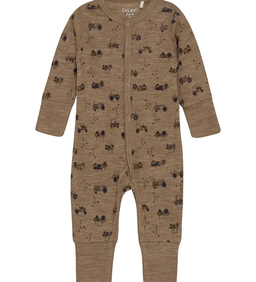 Charmerende CeLaVi heldragt i brun med et detaljeret traktorprint i mørke nuancer. Heldragten er dekoreret med små motiver, der tilføjer et fint udtryk til stoffets overflade, og den er lavet af blødt og lækkert merinould.