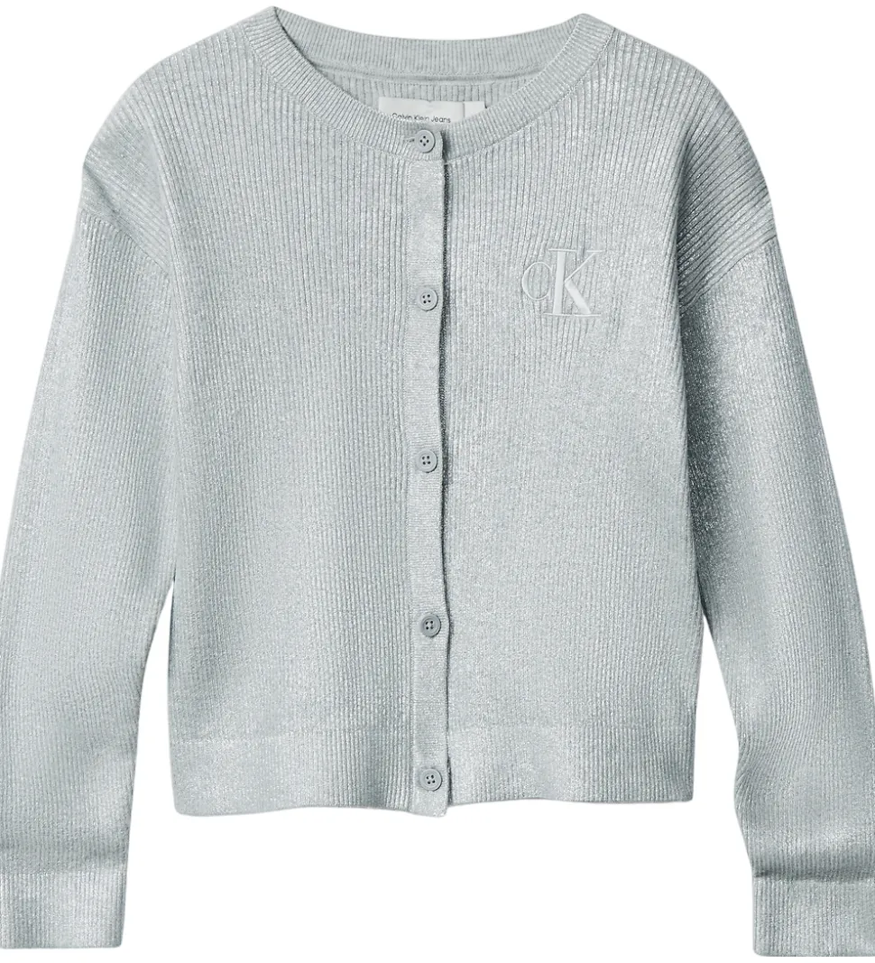 Stilfuld Calvin Klein cardigan i en elegant gråmeleret bomuldsstrik med en coating som giver et sølvfarvet udtryk. Calvin Klein cardiganen har lange ærmer og en fin ribstruktur, der giver et moderne udtryk. Foran findes en praktisk knaplukning, og venstre bryst prydes af det ikoniske Calvin Klein logo, som tilfører et eksklusivt touch.