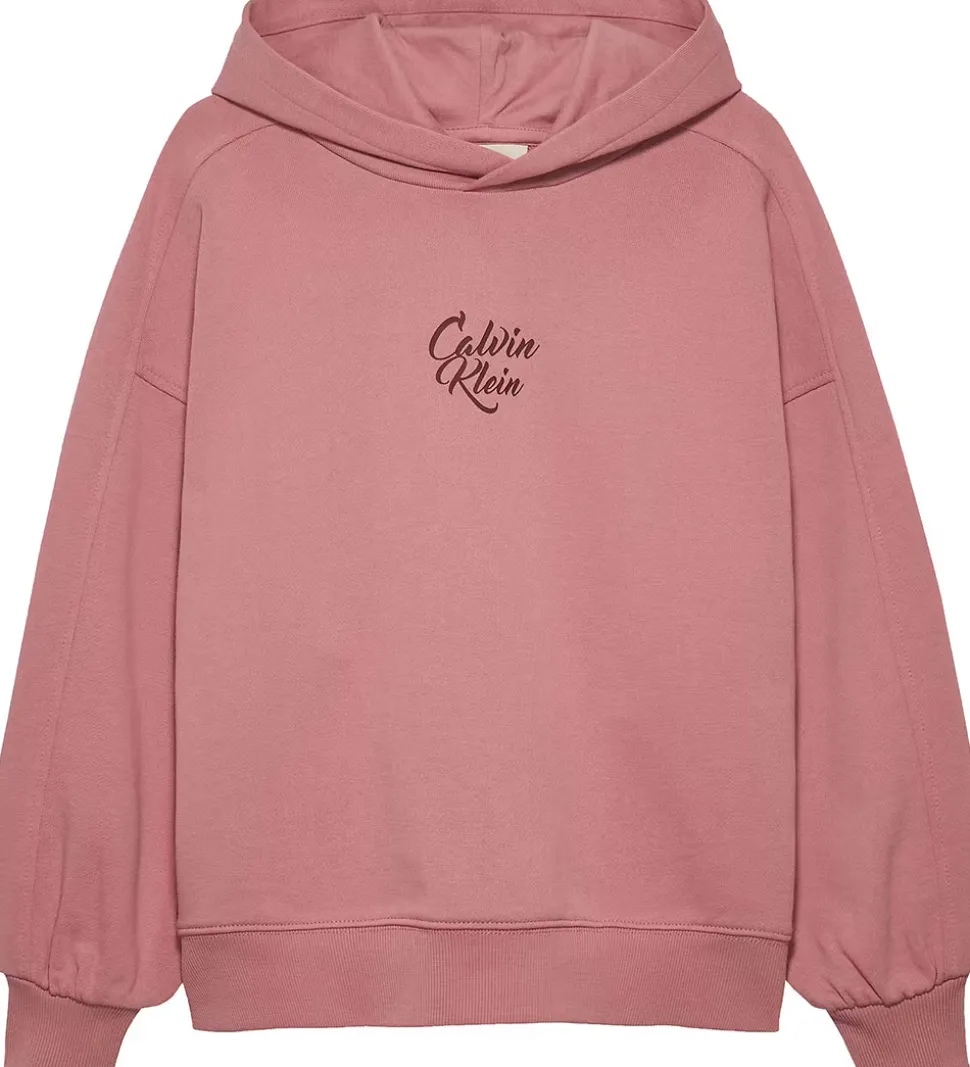 Stilren Calvin Klein hættetrøje i en blød rosa sweat med et elegant logoprint på brystet i bordeauxrød. Calvin Klein hættetrøjen har en praktisk hætte medet bomuldsfor og ribkant i både ærmer og livet, hvilket giver en flot pasform. Designet er enkelt og tidløst, perfekt til hverdagens behov.