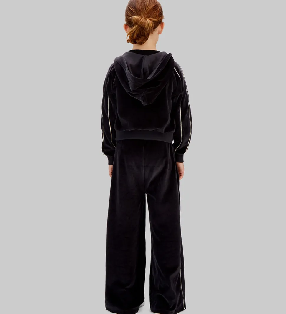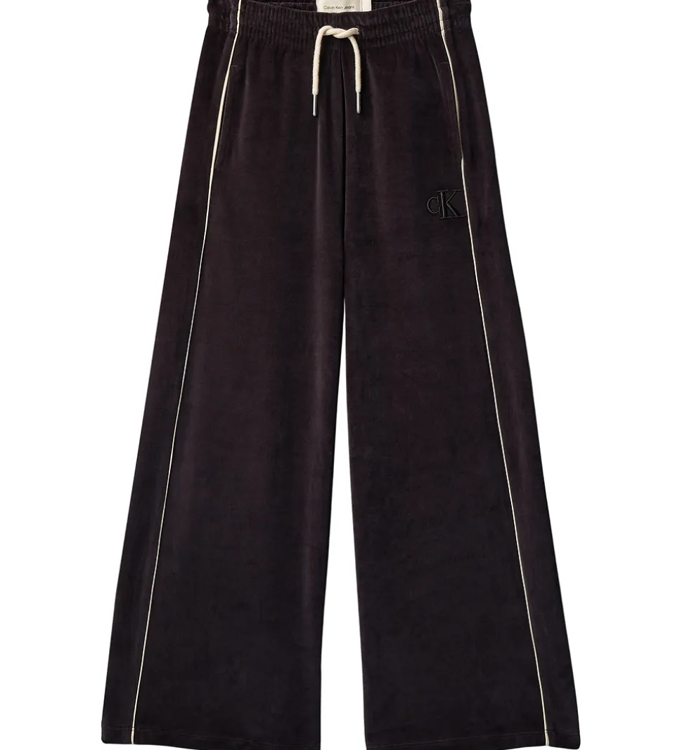 Stilfulde velourbukser fra Calvin Klein i sort velour med elegante hvide pipings langs benene, der giver et moderne look. Calvin Klein bukserne har en elastisk talje med praktiske snøre for justerbar pasform. Et diskret CK-logo fremhæver brandets karakteristiske stil. Buksebenene har en lige pasform, der falder flot over skoene og giver et afslappet udtryk.