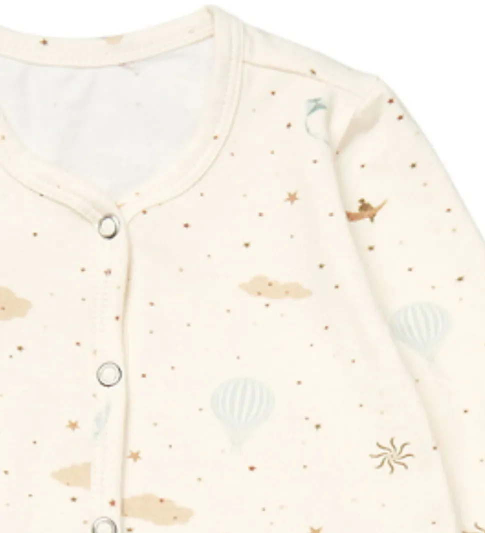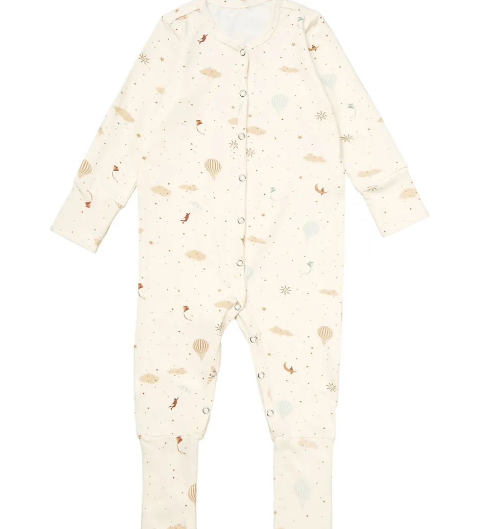 Sød Cam Cam heldragt i hvid med print af små stjerner, skyer, drager og luftballoner i blå og brune nuancer. Cam Cam heldragten har trykknapper fra hagen og ned til begge ben. Den har lange ærmer og lange ben med mulighed for ombuk til lukkede hænder og fødder.