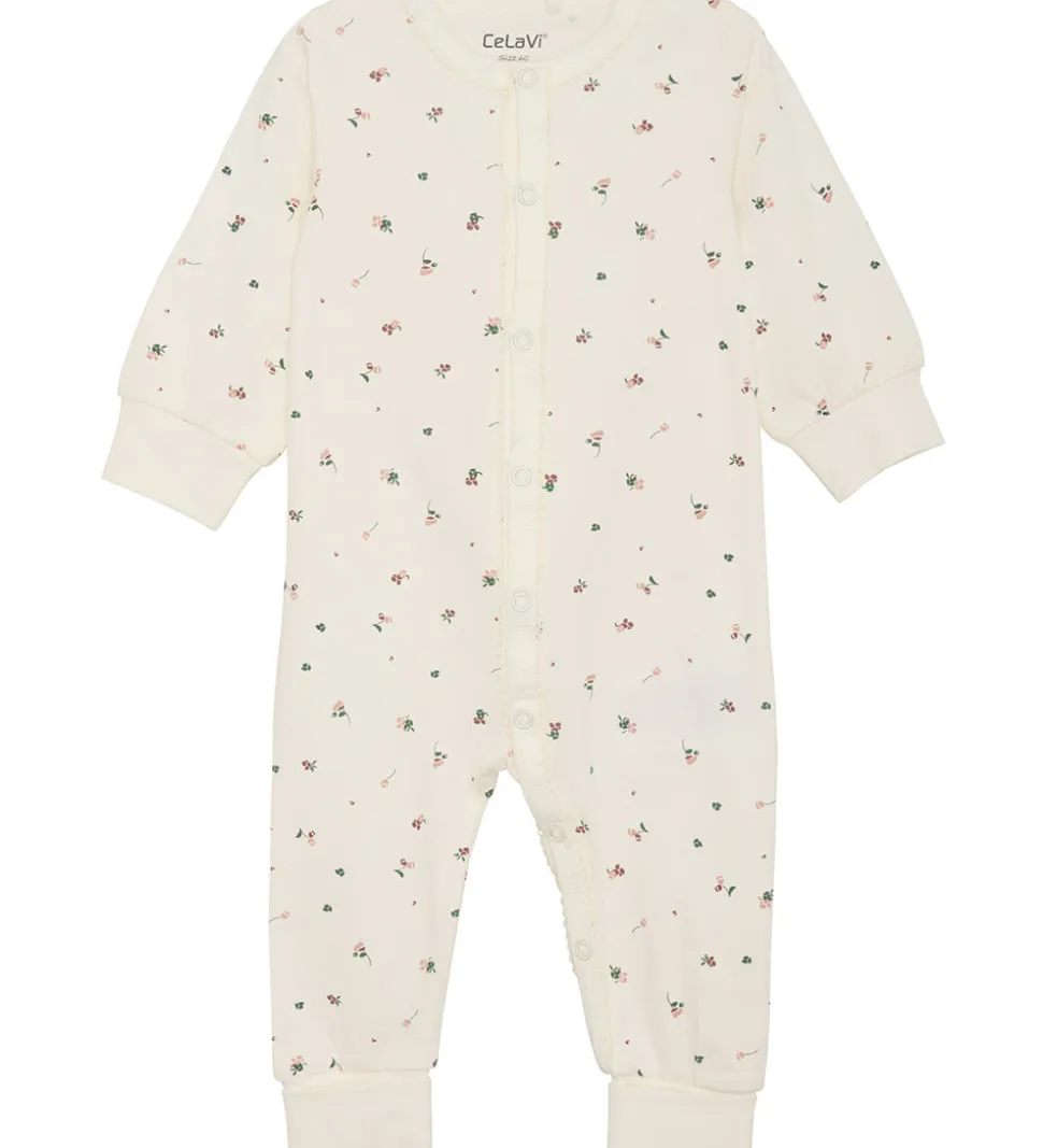Skøn CeLaVi heldragt i cremehvid med et allover print af små blomster i rosa og grøn.