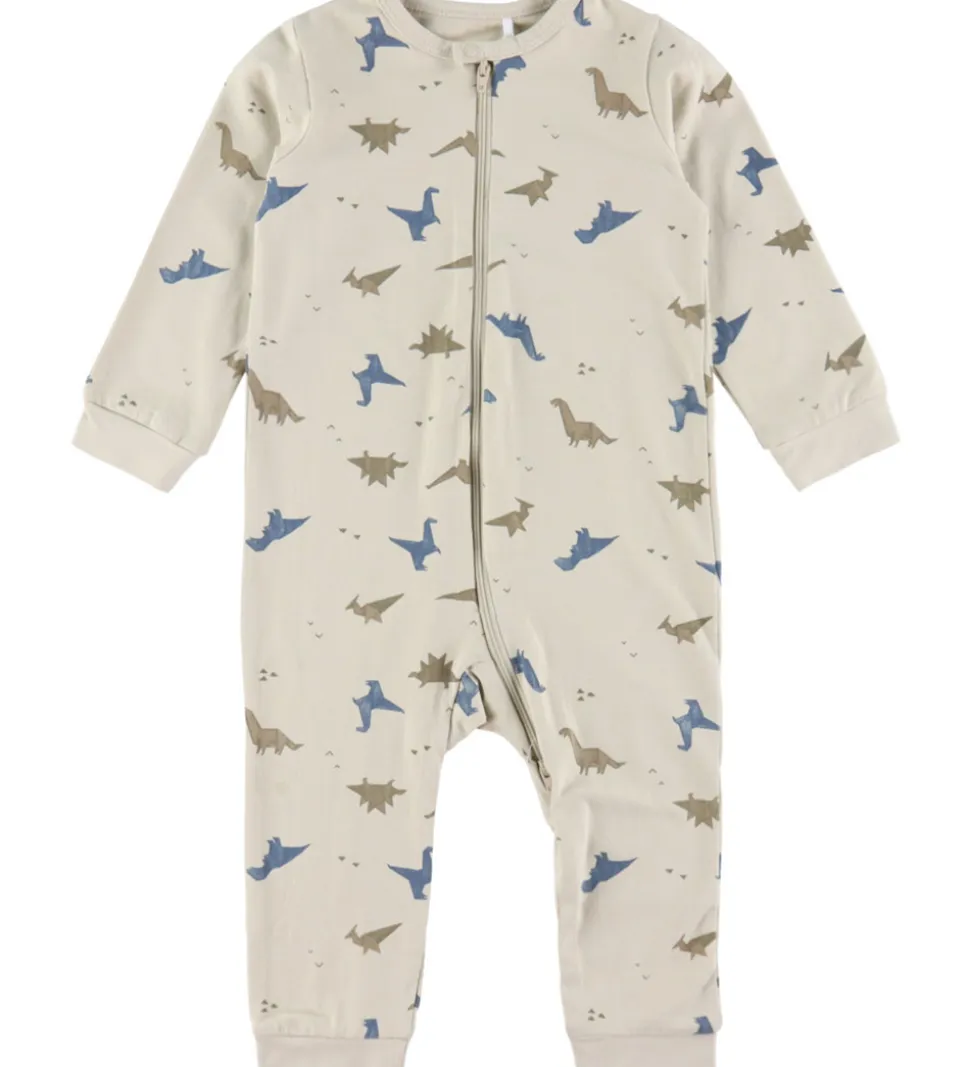 Sød CeLaVi natdragt i beige med print af dinosaurer i armygrøn og mørkeblå. Natdragten har en rund halsudskæring med en trykknap fortil. Den har lange ærmer og ben, og lukkes fortil med en lynlås med to skydere. Natdragten har mulighed for ombuk til lukkede hænder og fødder.