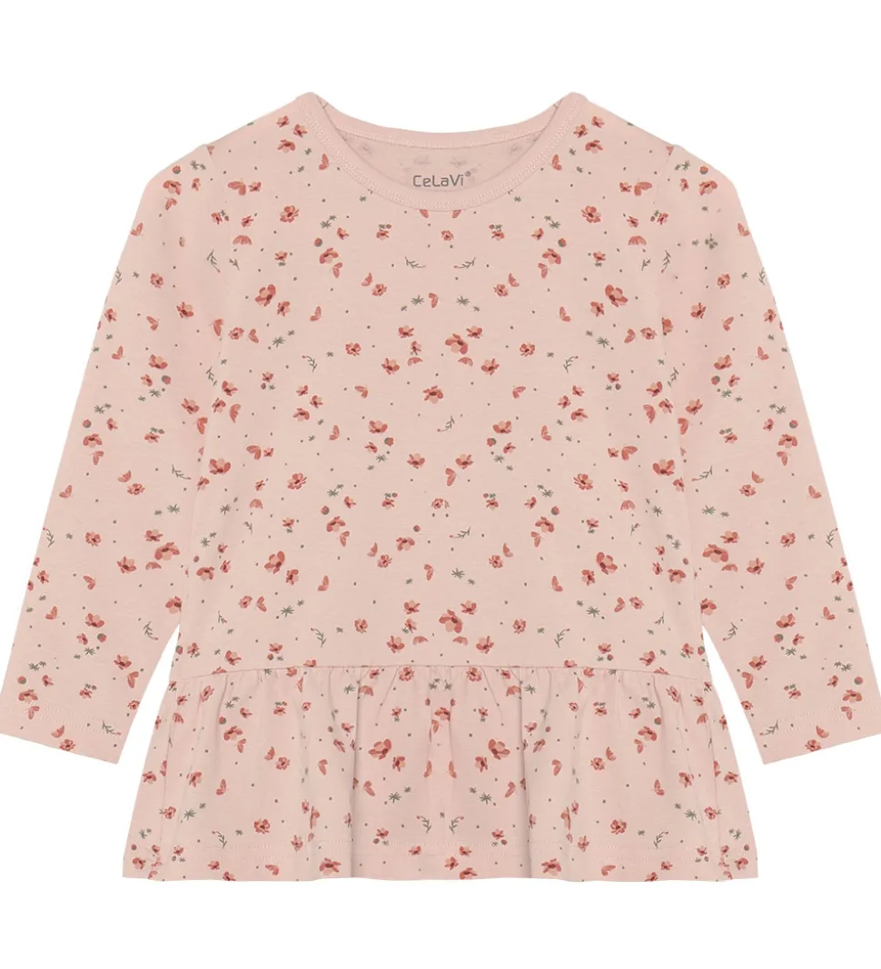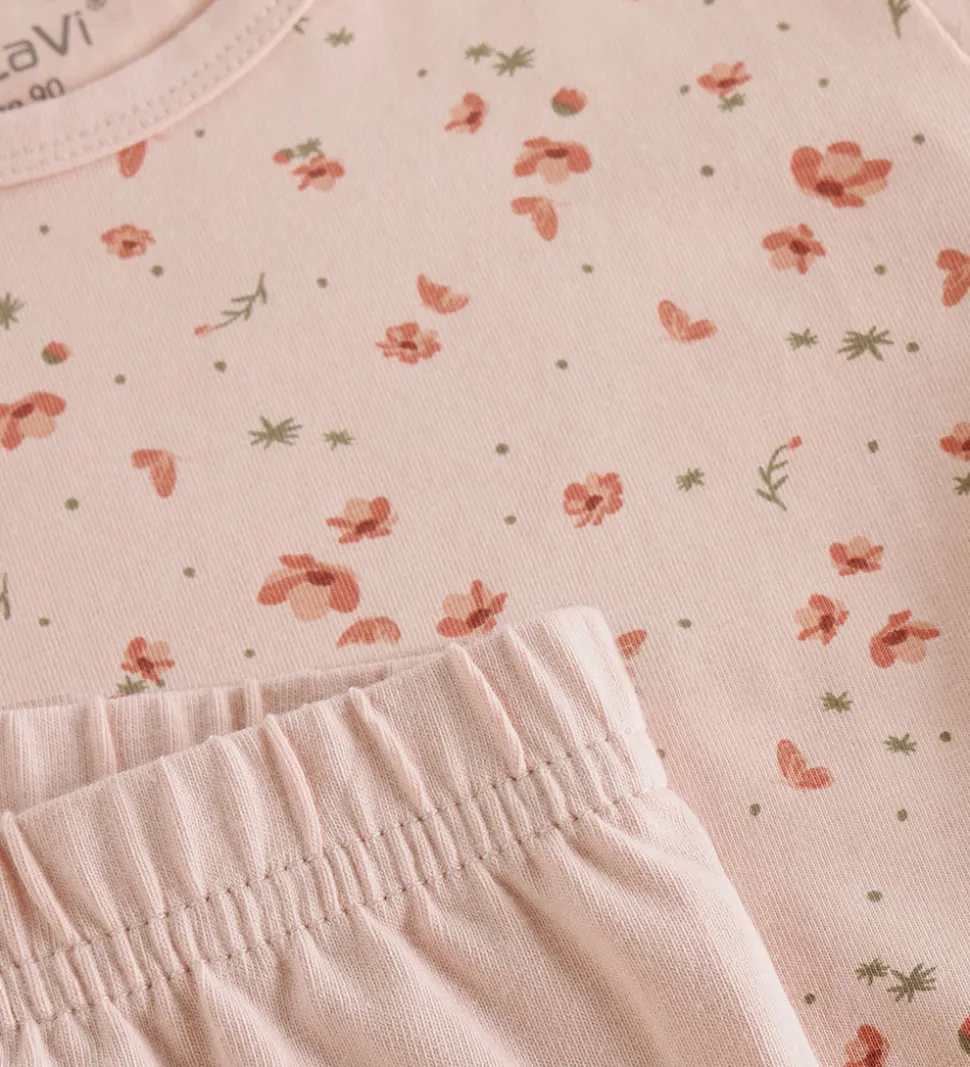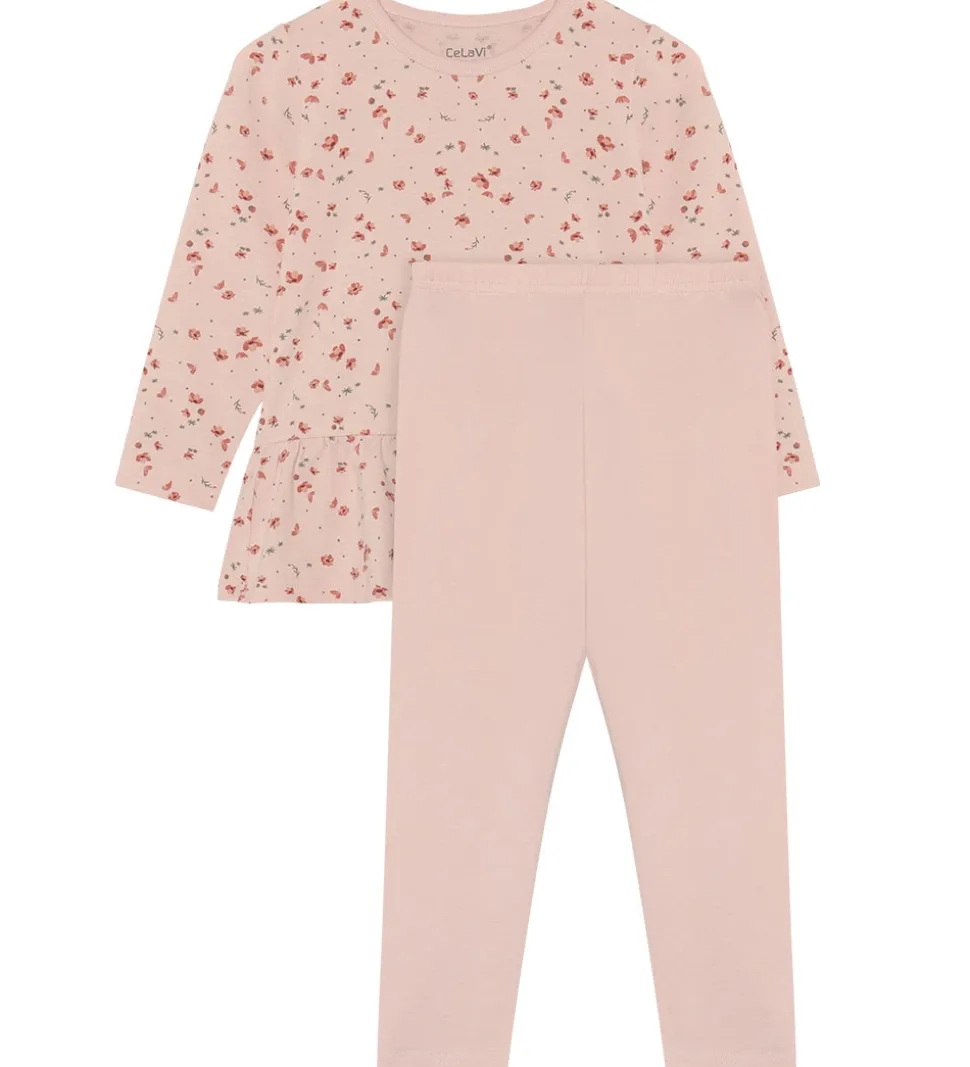 Fint CeLaVi nattøj i rosa bestående af en natbluse og et par natbukser. Natblusen har har blomsterprint og lange ærmer. Nederst er der en flæsedetalje. Natbukserne har elastik i taljen og en tætsiddende pasform.