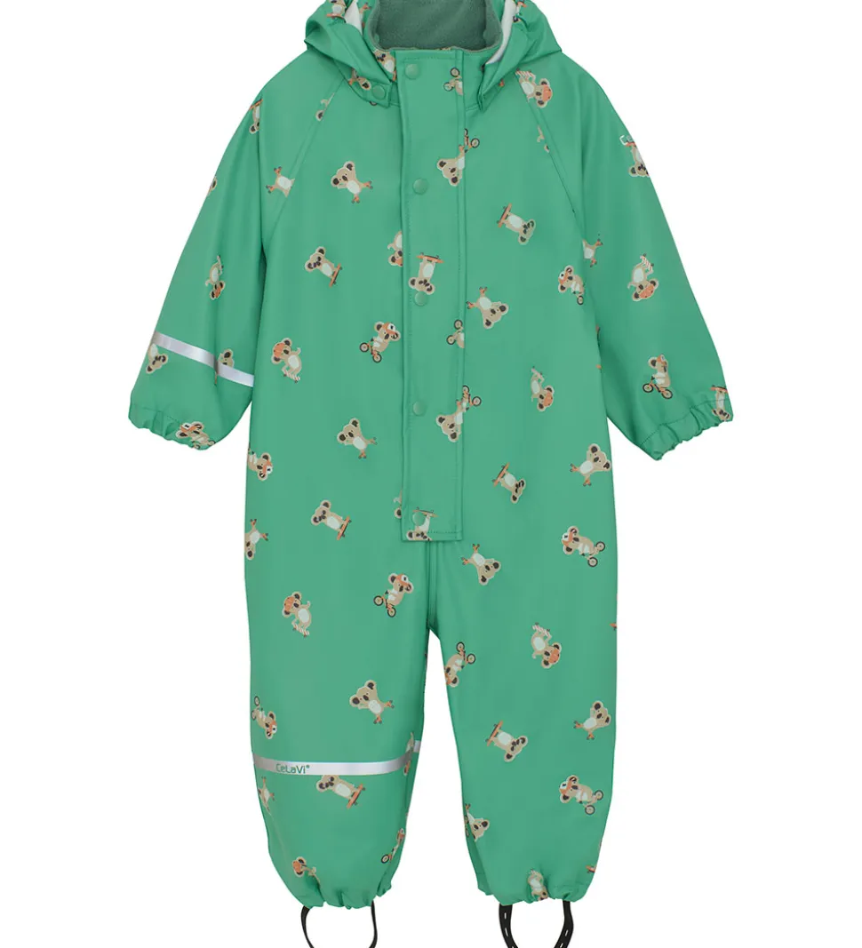Skøn CeLaVi regndragt i grøn PU med print af skaterkoalaer.