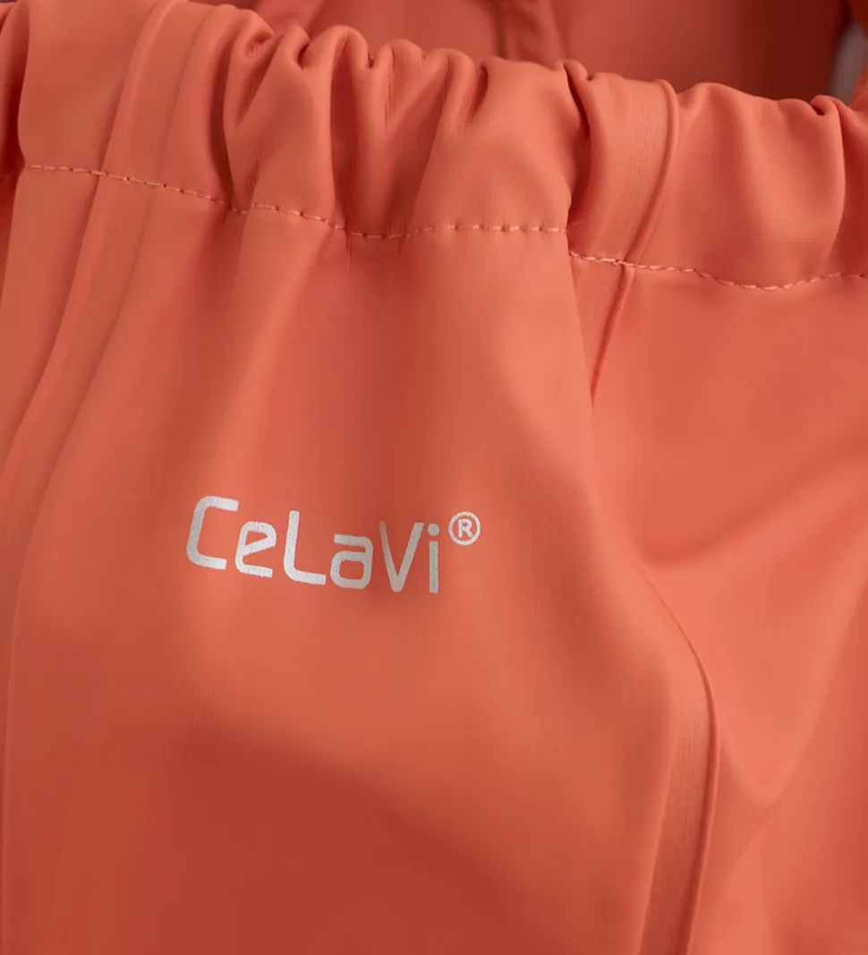 CeLaVi regndragten har en aftagelig hætte, som sidder fast med trykknapper. Ærmerne og buksebenene har elastikkanter, og der er justerbare elastikstropper til at sætte under fodtøjet. Kraven er foret med blødt fleece.