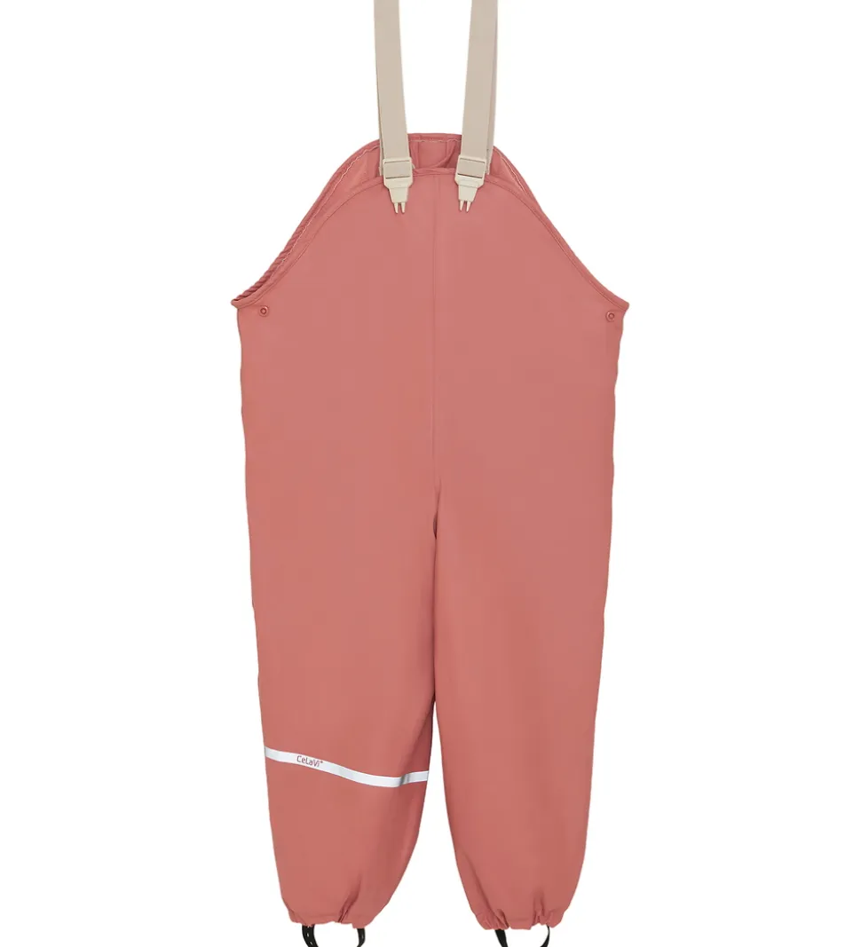 Skønt CeLaVi regntøj af PU i mørk støvet rosa med lyst hesteprint, bestående af en regnjakke og et par regnbukser med seler. Regntøjet er forsynet med praktiske reflekser.