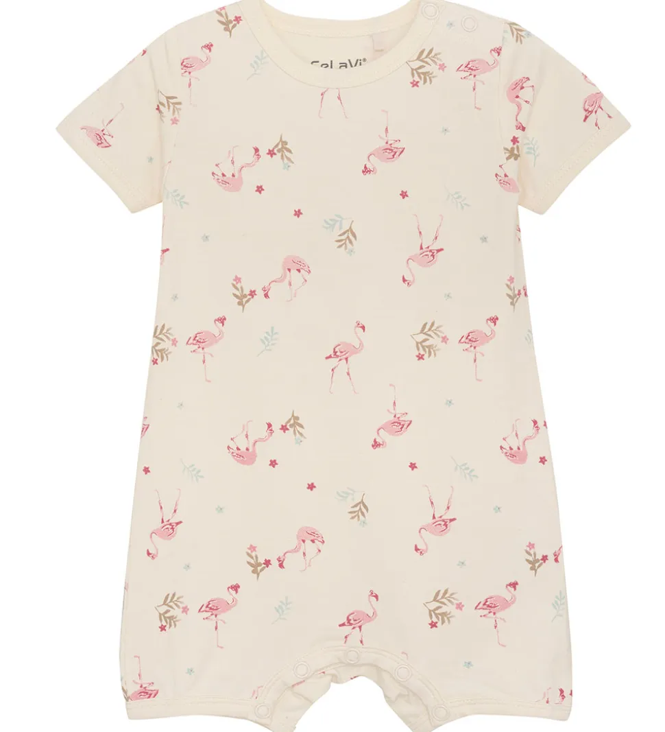 Sød CeLaVi sommerdragt i hvid, med et alloverprint af søde flamingoer og blade i rosa, brune og grønne nuancer.