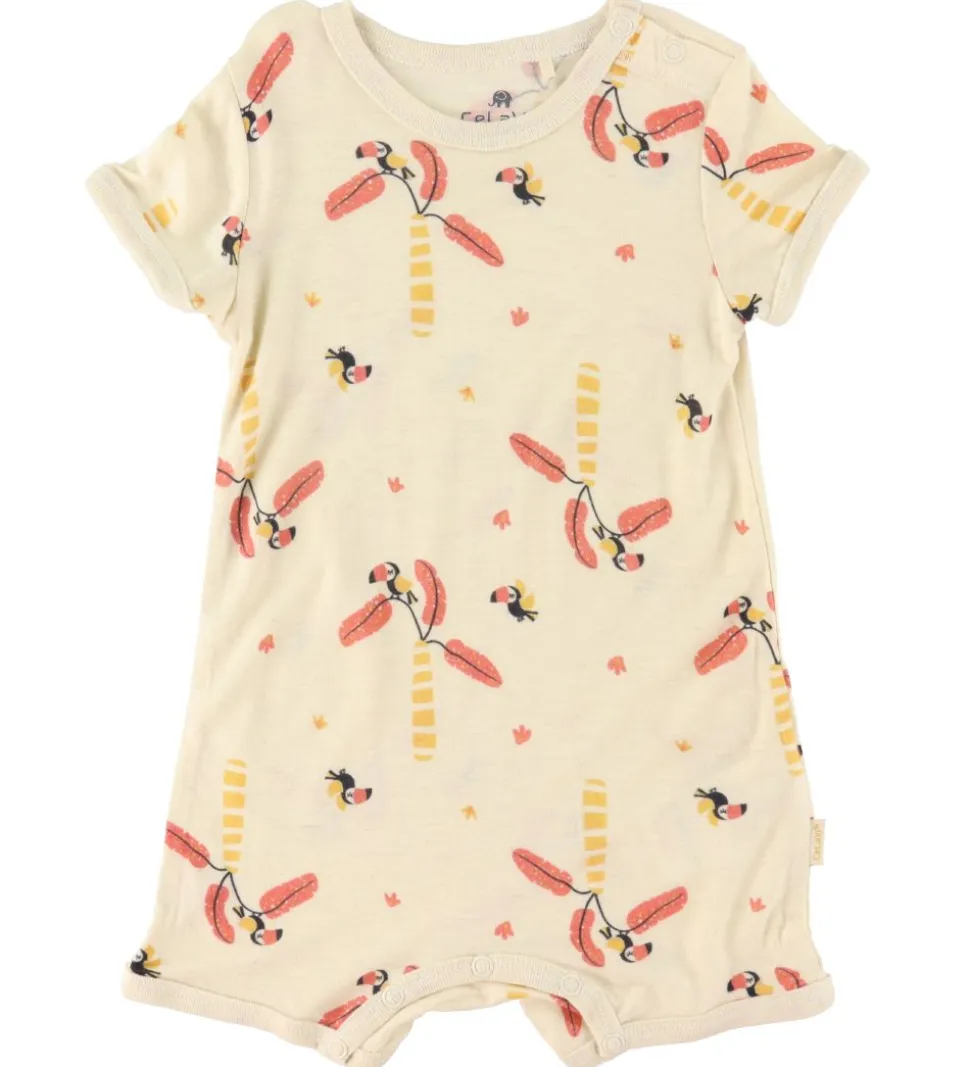 CeLaVi sommerdragten har korte ærmer og ben. Den åbnes ved den venstre skuler med to trykknapper, og mellem benene er der også trykknapper.