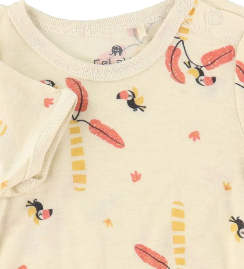 Flot CeLaVi sommerdragt i hvid med allover print af rosa, gule og sorte fugle.
