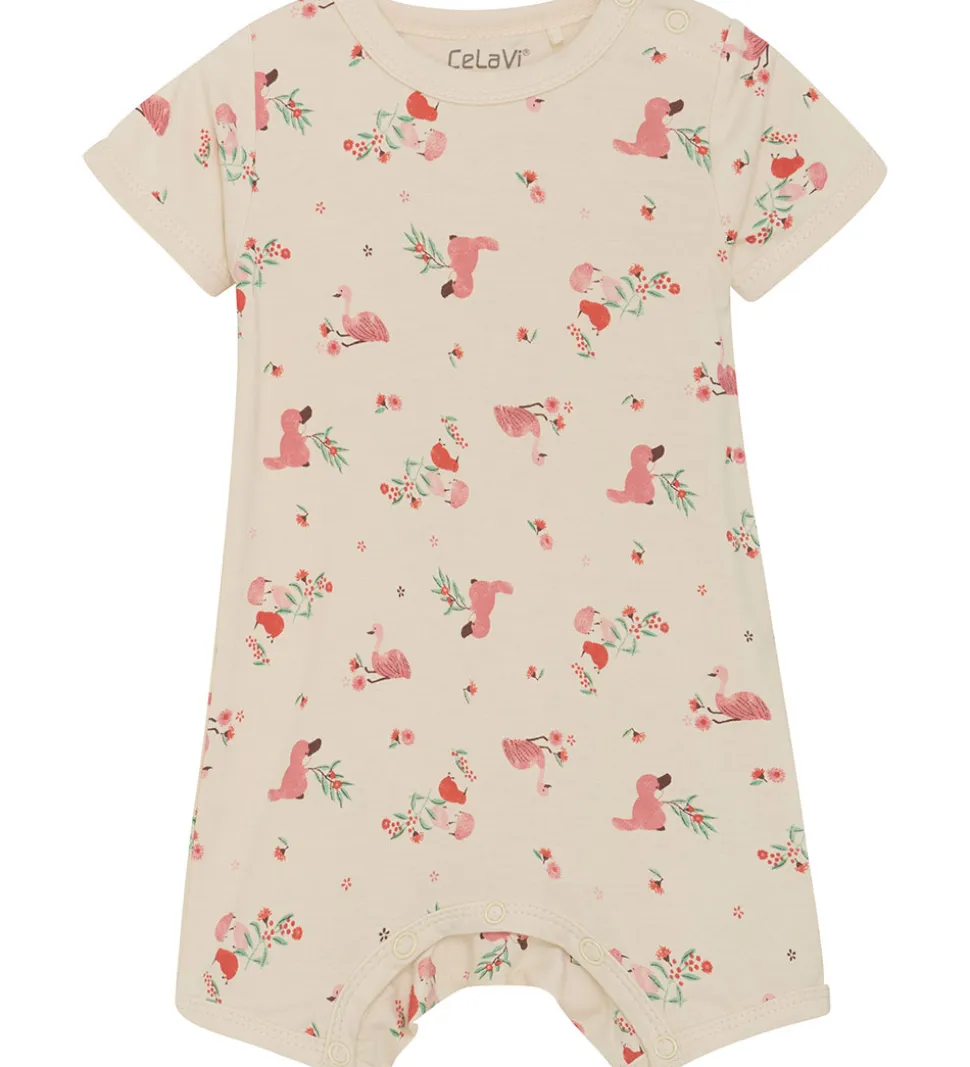 Skøn CeLaVi sommerdragt i en lys beige farve med et fint blomster- og dyreprint på fronten. Dragten har korte ærmer og praktiske trykknapper, der gør påklædningen nemt for både barn og forælder.