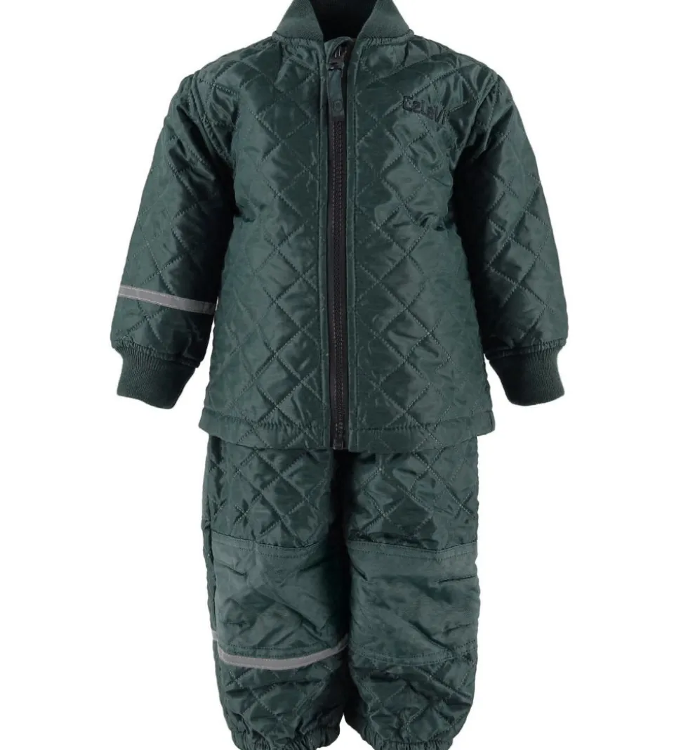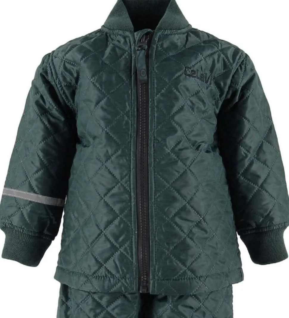 Smart CeLaVi termotøj bestående af en jakke og et par bukser i mørkegrøn med et flot quiltet design.