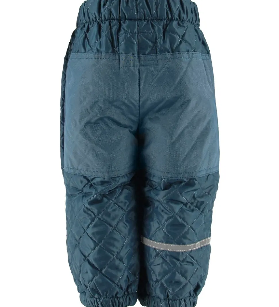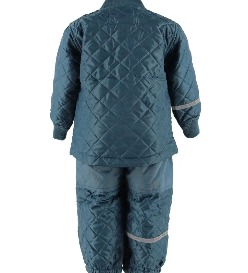 Skønt CeLaVi termotøj bestående af en jakke og et par bukser i mørk petroleum med quiltet struktur. Omkring højre arm samt venstre ben er der en praktisk refleks.