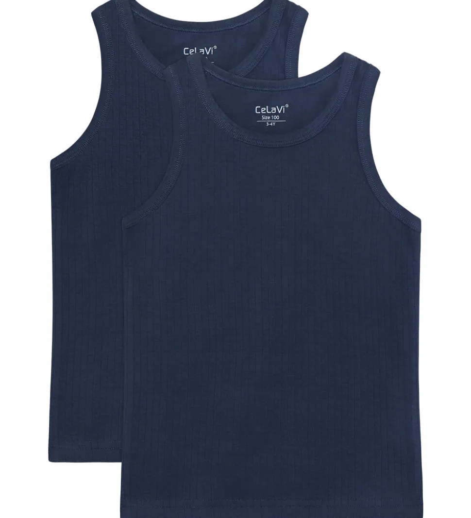Smarte CeLaVi undertrøjer solgt i en 2-pak i ensfarvet mørkeblå med ribstruktur. Undertrøjerne har brede skulderstropper og er fremstillet i en blød kvalitet.