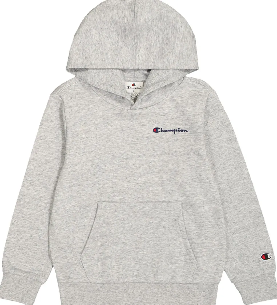 Lækker Champion Hættetrøje i grå med et klassisk logoprint på fronten i rød og blå. Hættetrøjen har lange ærmer og en praktisk kængurulomme foran.