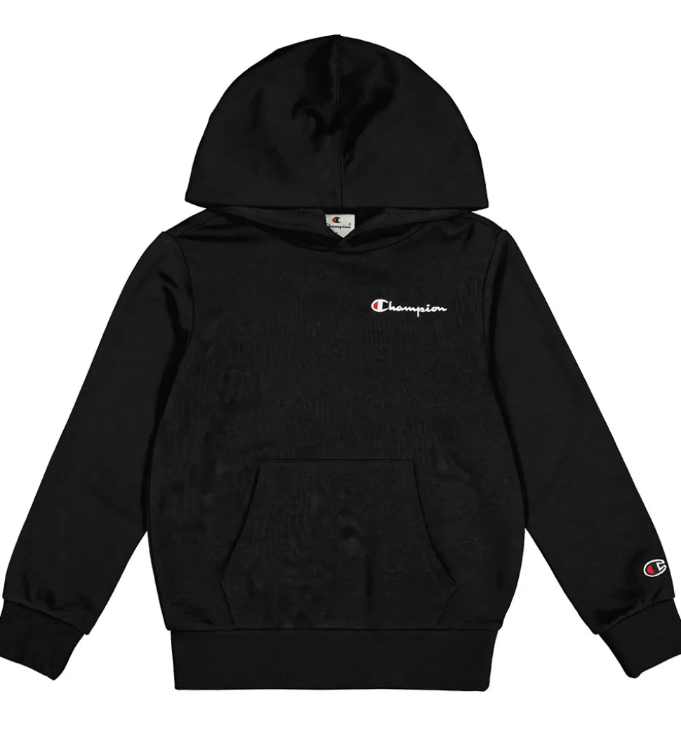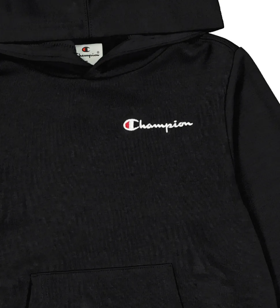 Stilfuld Champion hættetrøje i sort med et diskret logoprint broderet på fronten. Denne hættetrøje har lange ærmer og en praktisk kængurulomme foran, perfekt til skoledagen eller afslapning derhjemme.