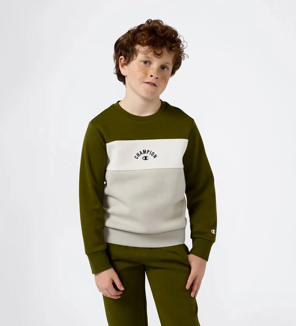 Sej Champion sweatshirt i en farvekombination af mørkegrøn, lys beige og lysegrøn. På fronten er der et broderet logo i navyblå. Sweatshirten har lange ærmer og ribkanter ved alle åbninger. Indvendigt er der blødt, børstet bomuld.