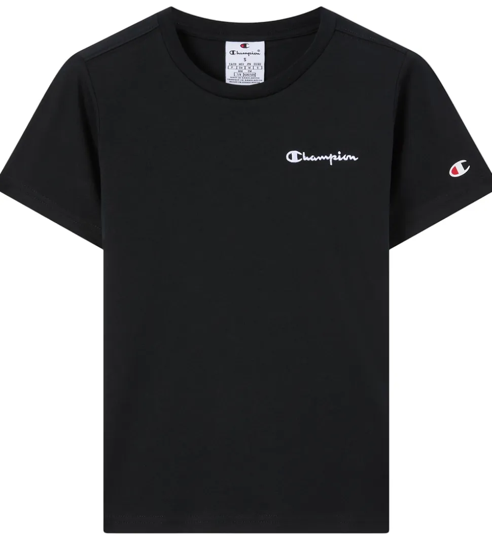 Stilfuld Champion t-shirt i sort. T-shirten har et broderet logo i hvid på venstre bryst. Champion t-shirten har en rund halsudskæring med en smal ribkant og korte ærmer.