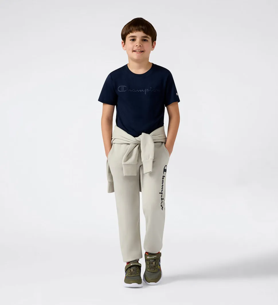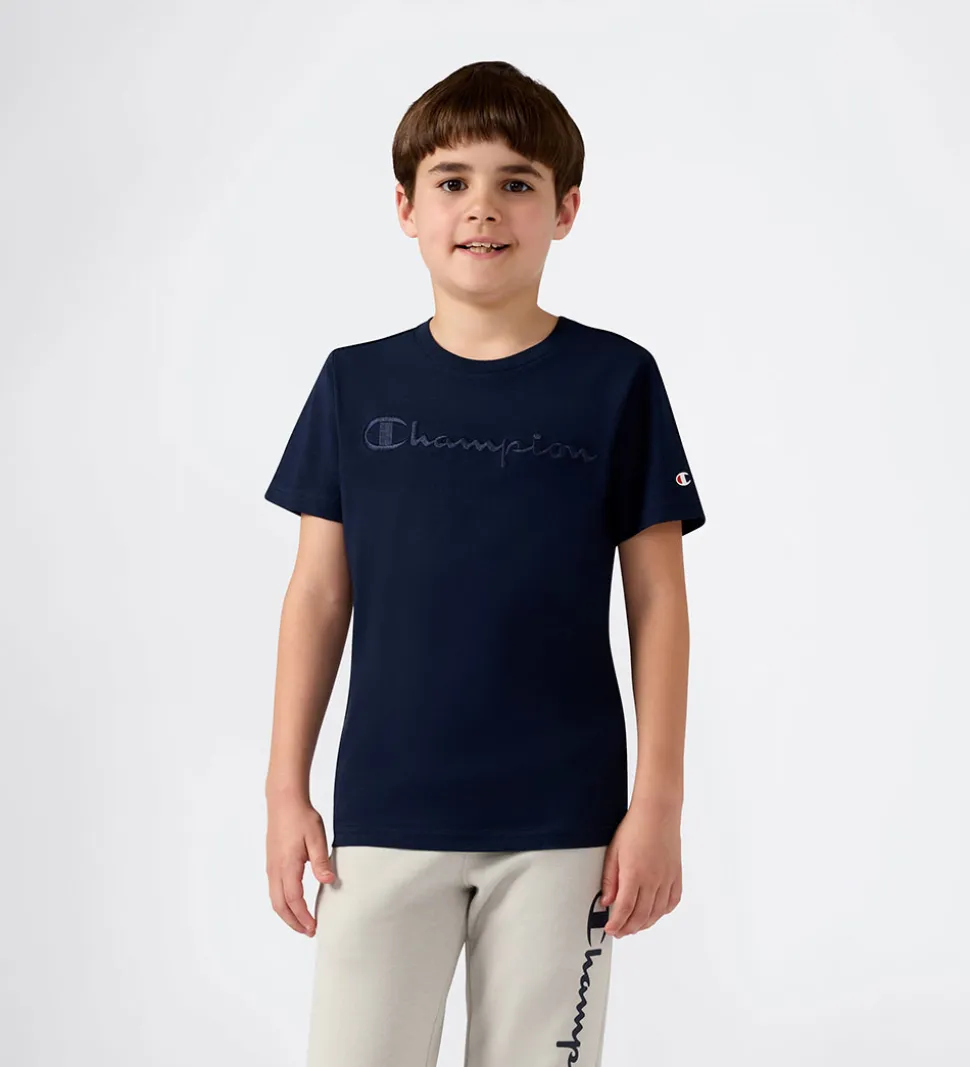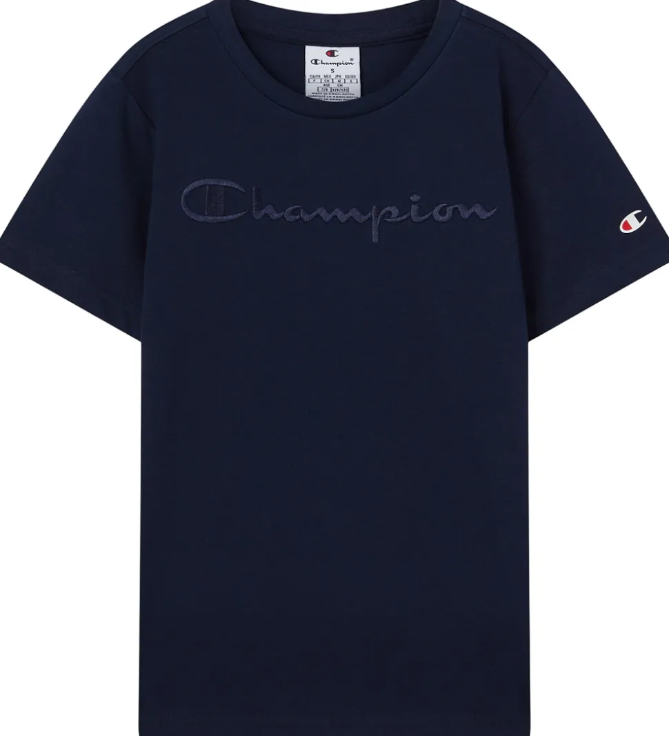 Flot Champion t-shirt i navyblå med et stort, broderet logo på brystet i samme farve som t-shirten. Champion t-shirten har en rund halsudskæring med en smal ribkant og korte ærmer.