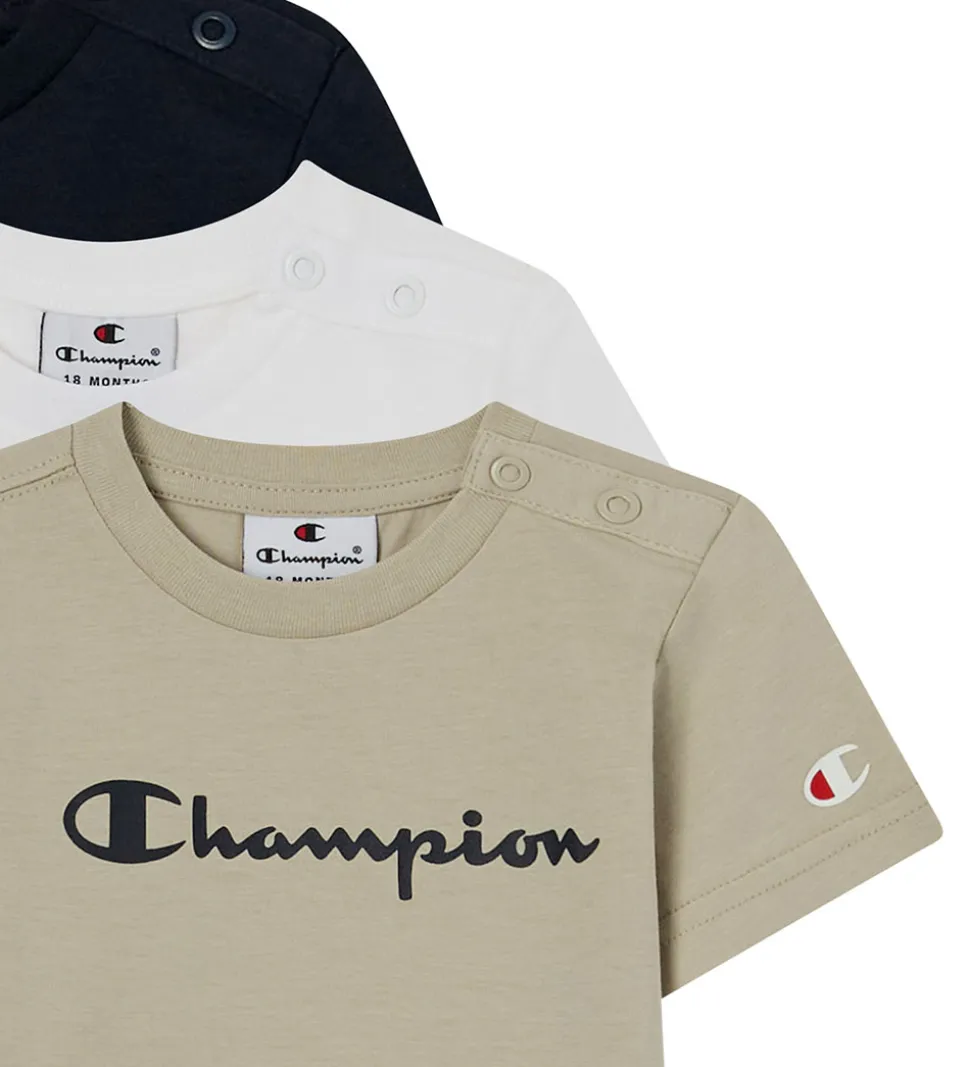 Flotte t-shirts fra Champion solgt i en 3-pak i navyblå, hvid og lysegrøn med et stort logo på brystet af alle tre t-shirts. Champion t-shirtsene har rund halsudskæring med trykknapper ved venstre skulder og korte ærmer.