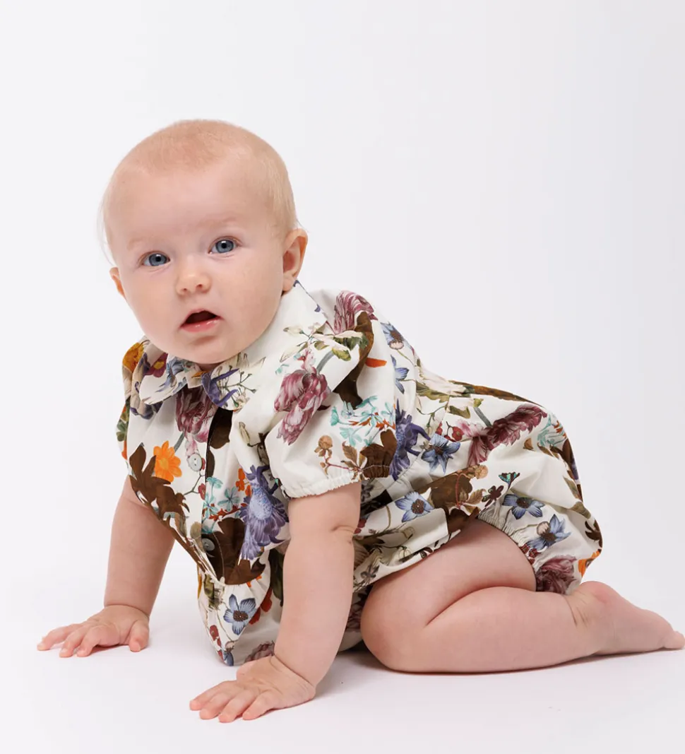 Christina Rohde heldragten har korte ærmer, og i halsåbningen er der en sød krave. I arm- og benåbningerne er der smalle elastikkanter, som giver en god pasform. Under brystet er der en syning som gør at underdelen får god vidde og søde folder. Den kan åbnes fra halsen og ned mod brystet samt mellem benene med knapper.