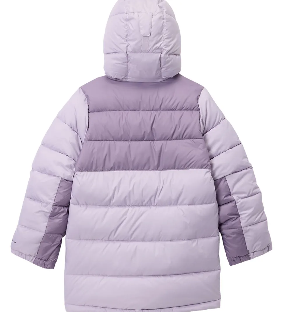 Skøn Columbia dynejakke i støvede, lilla nuancer med et logoprint på venstre bryst og med klassiske, vandrette syninger.