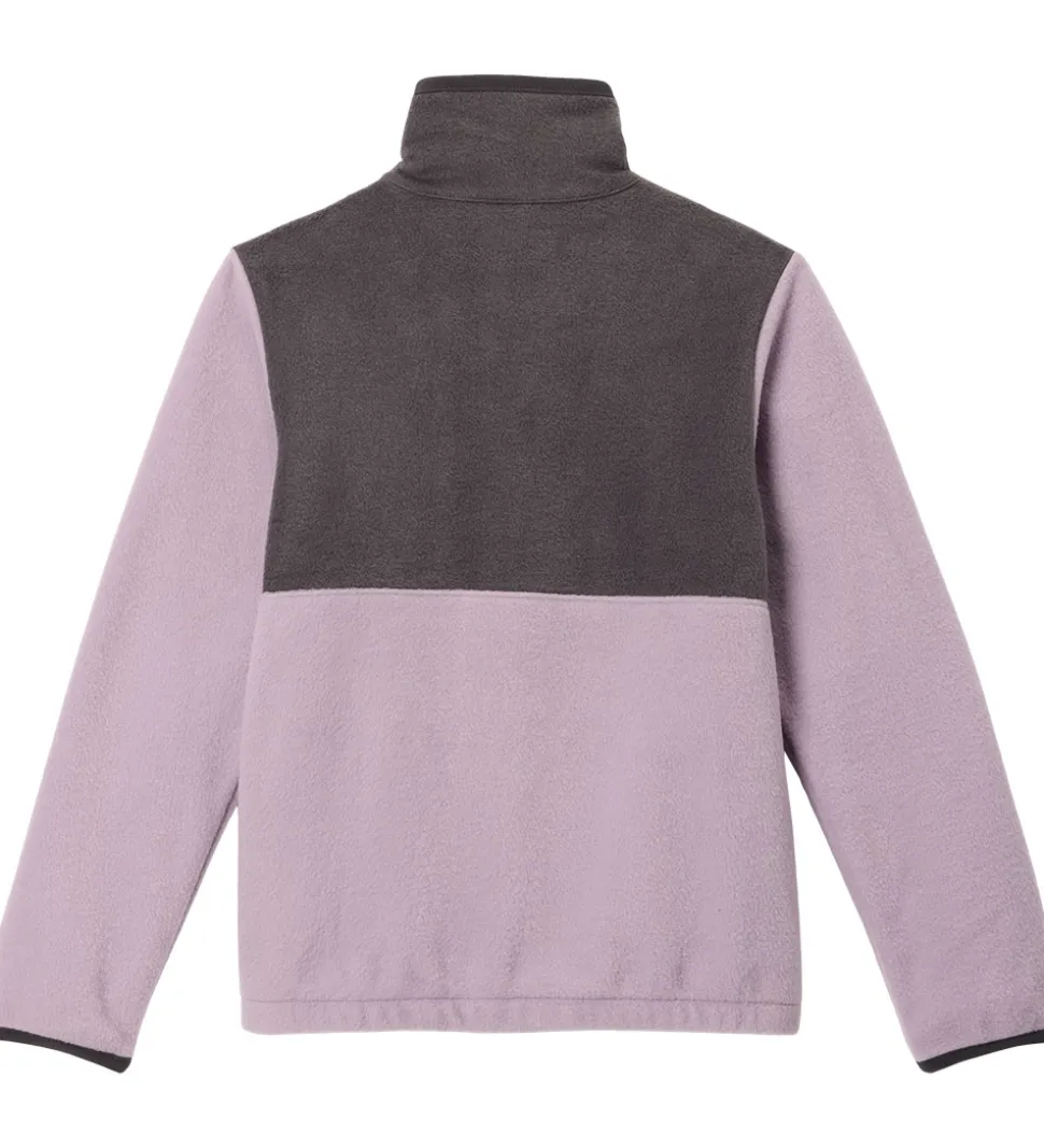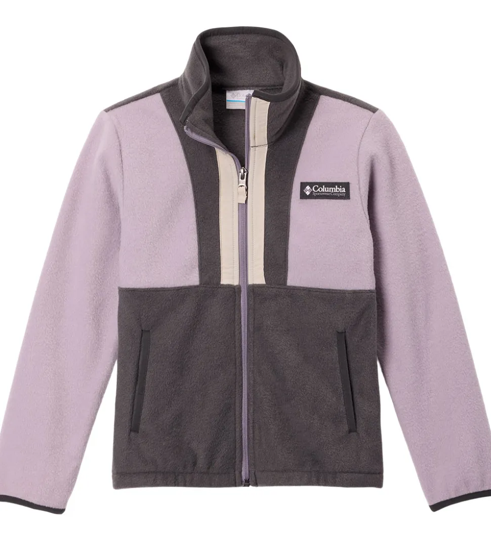 Flot Columbia fleecejakke i støvet lilla og koksgrå fleece med glatvævede kanter i beige og koksgrå. Fleecejakken har et logo på venstre bryst.