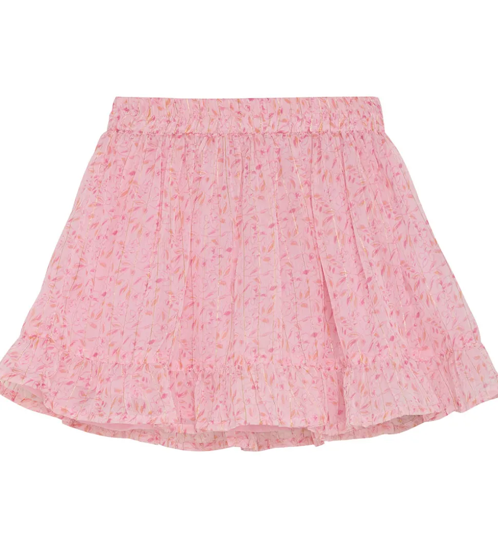 Skøn Creamie nederdel i rosa med et fint blomsterprint i pink og orange samt smalle striber i guld. Nederdelen har en god elastikkant i taljen og en let flæse i bunden. Den består af to lag med et lag bomuld inderst, som sikrer at nederdelen ikke er gennemsigtig.