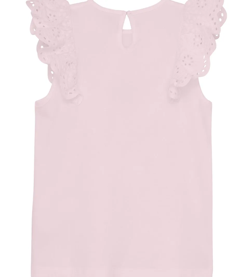 Skøn Creamie top i lys rosa med dekorative blonder ved skuldrene. Toppen har en rund halsudskæring med en knap i nakken. Den har en enkel stil, der giver et sødt og feminint udtryk.
