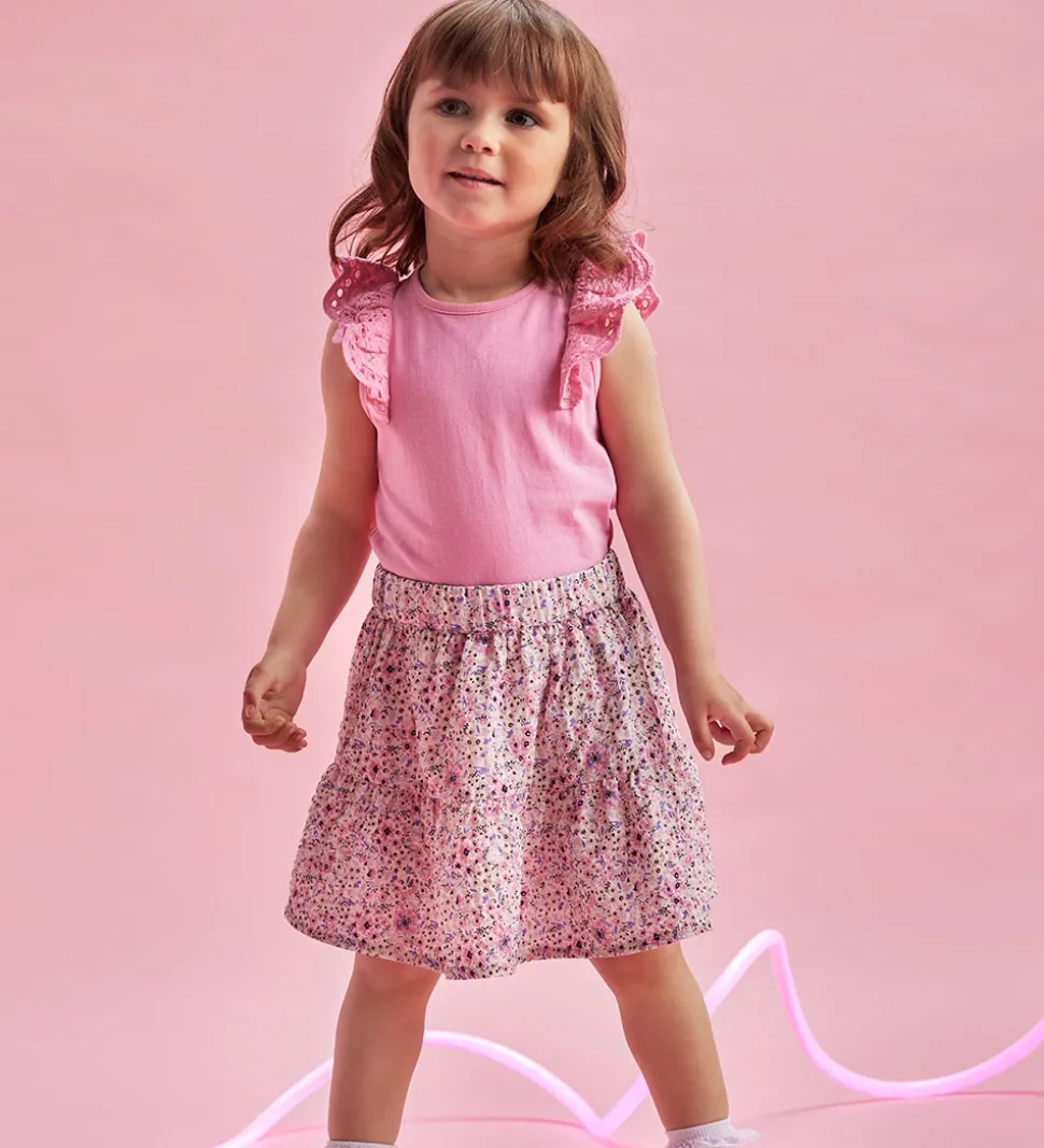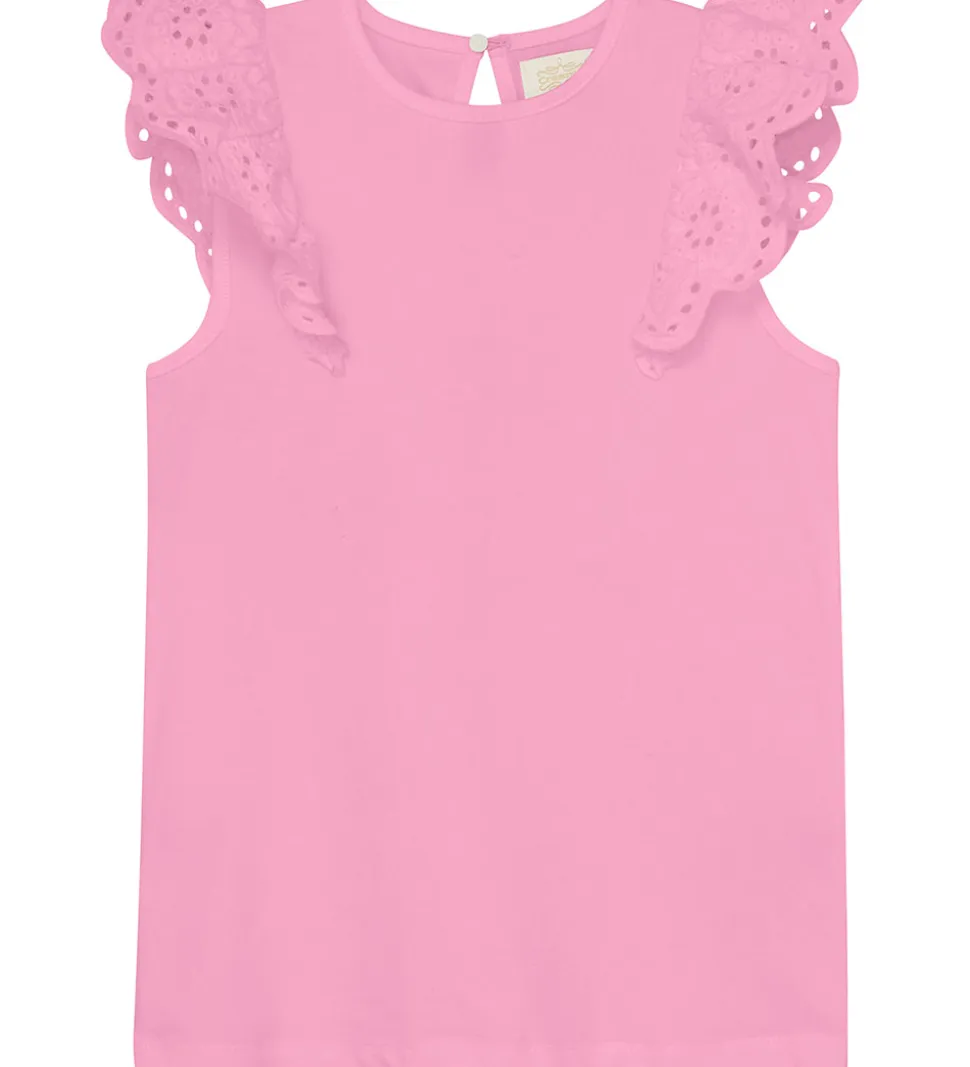 Skøn Creamie top med korte ærmer i en lys pink nuance. Toppen har fine detaljer med flæser i broderie anglaise ved skuldrene, hvilket tilføjer et sødt præg til det enkle design. Toppen har en knap- og elastiklukning i nakken.