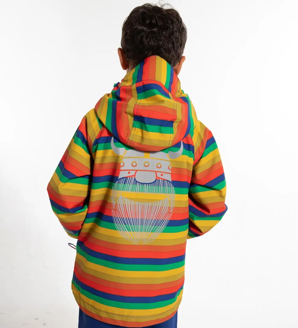 Fin Danefæ sommerjakke med vandrette striber i rød, blå, grøn, gul, karrygul og rødbrun. På ryggen er der et stort refleksprint af en viking.