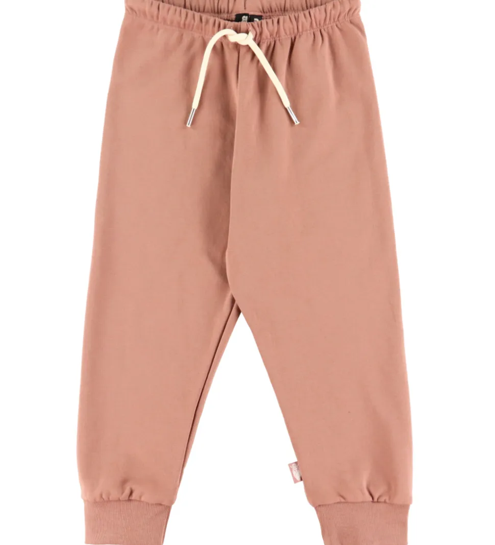 Flotte Danefæ sweatpants i en rosabrun nuance. Sweatpantsene har en elastisk talje med lyse snøre, der kan justeres for bedre pasform. Ved anklerne er der brede ribkanter og indvendigt er der blødt, børstet bomuld.