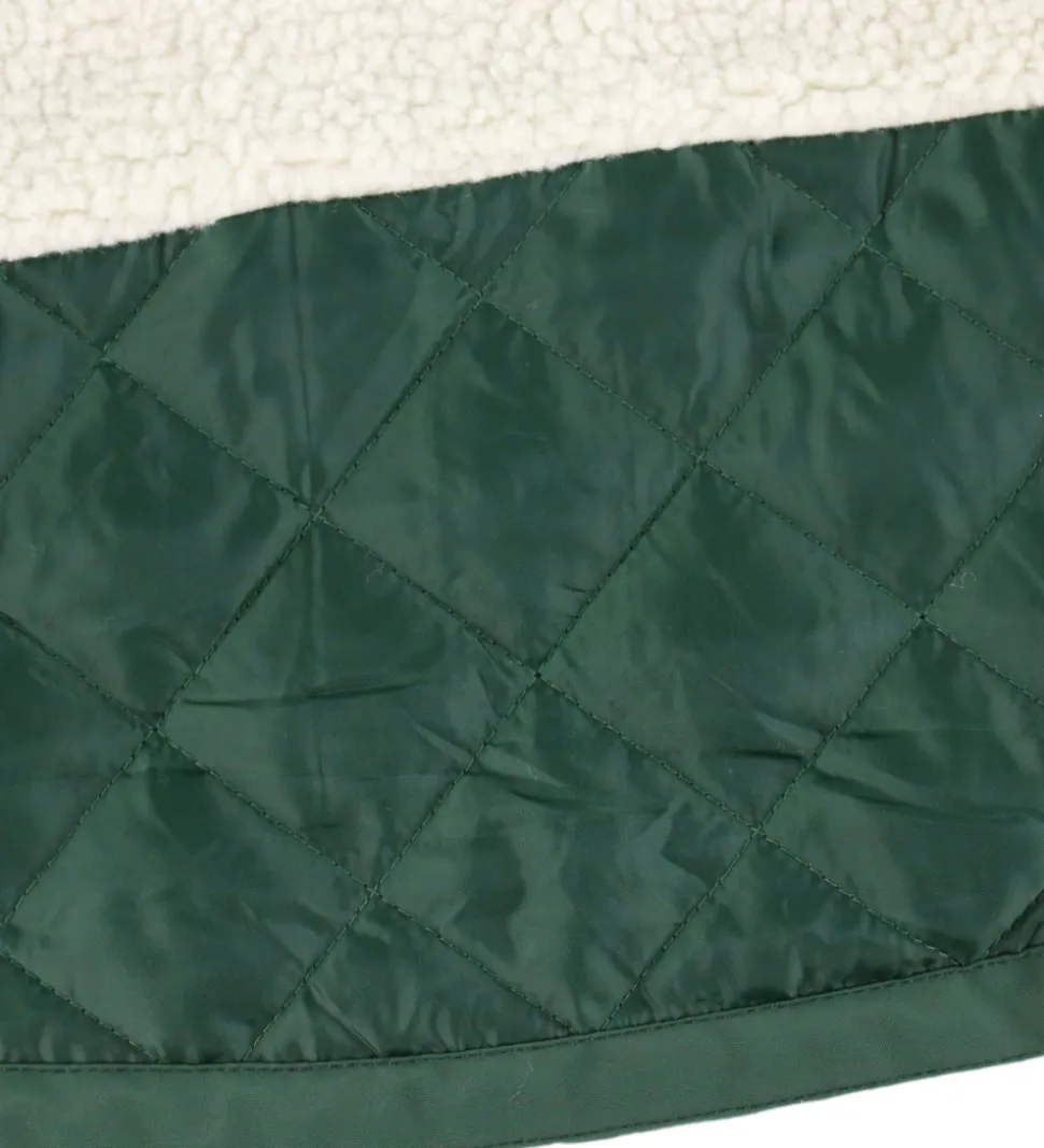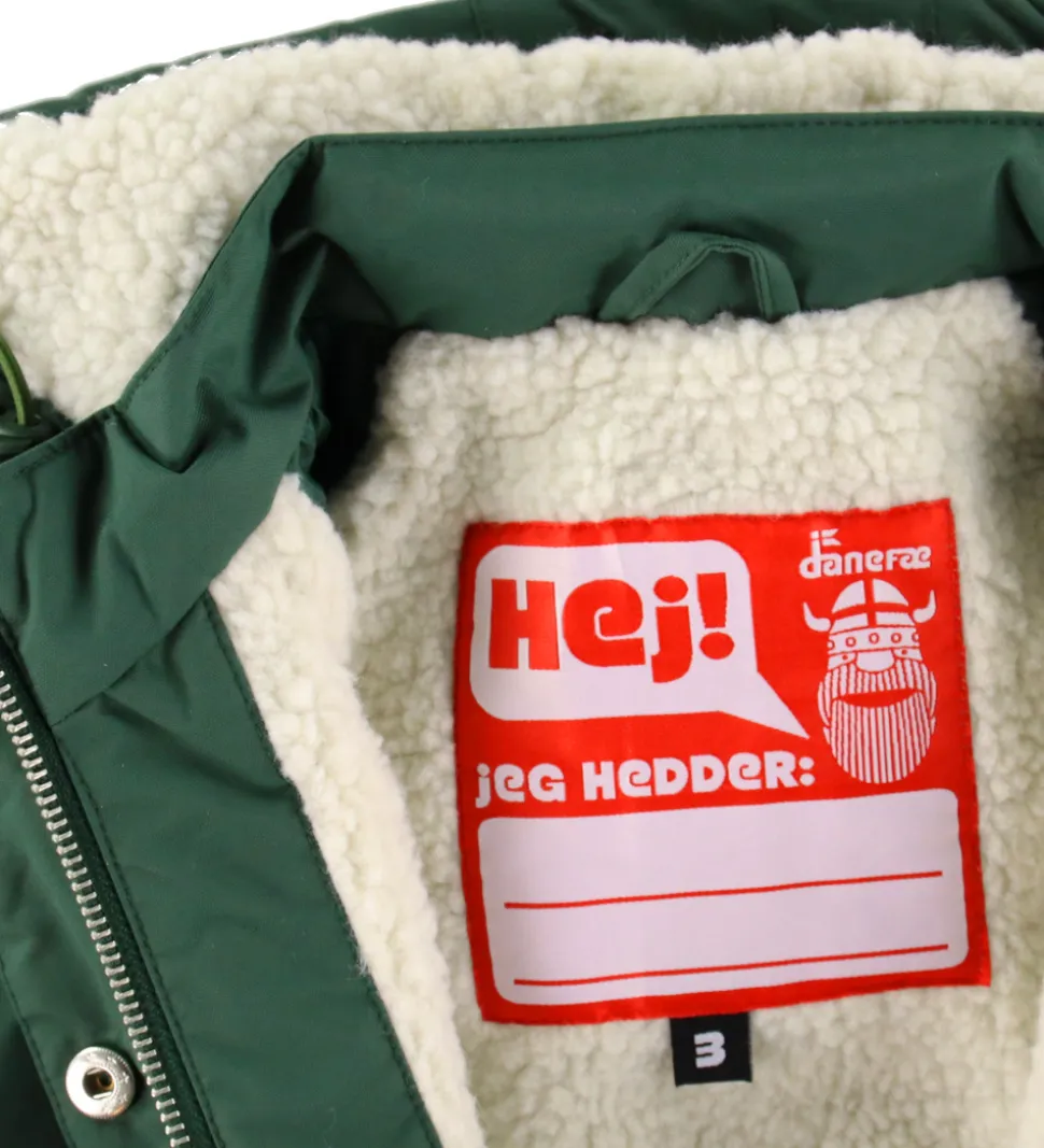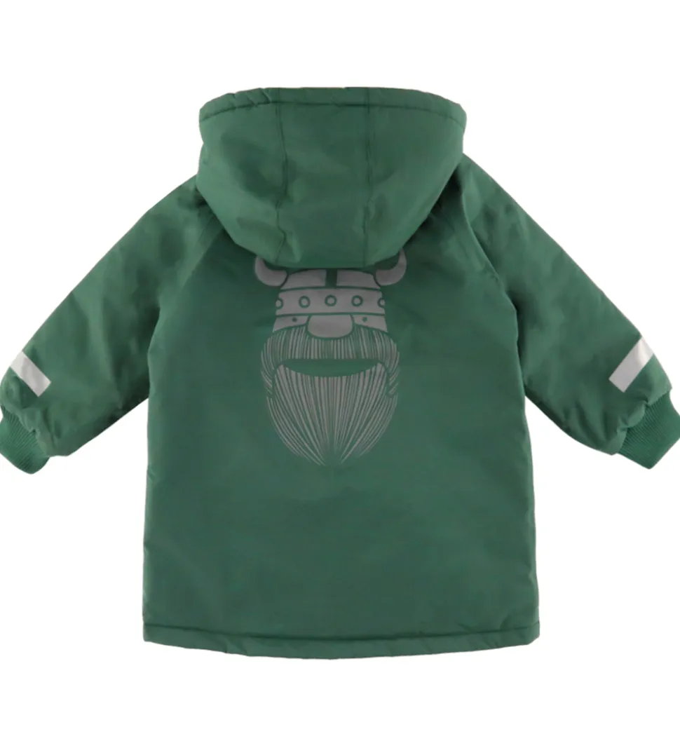 Funktionel Danefæ vinterjakke i mørkegrøn med refleksdetaljer på ærmerne og et stort refleksprint af en viking på ryggen. Vinterjakken har en aftagelig hætte, som sidder fast langs kravens kant med trykknapper. Den har brede ribkanter i ærmeåbningerne, og lukkes med en gennemgående lynlås foran med hagebeskytter og dobbelt vindtolpe, hvoraf den yderste kan lukkes med trykknapper. Foran er der en lomme i hver side. Indvendigt er der hvidt, imiteret uld i kroppen og i hætten, mens der er qulitet struktur i ærmerne.