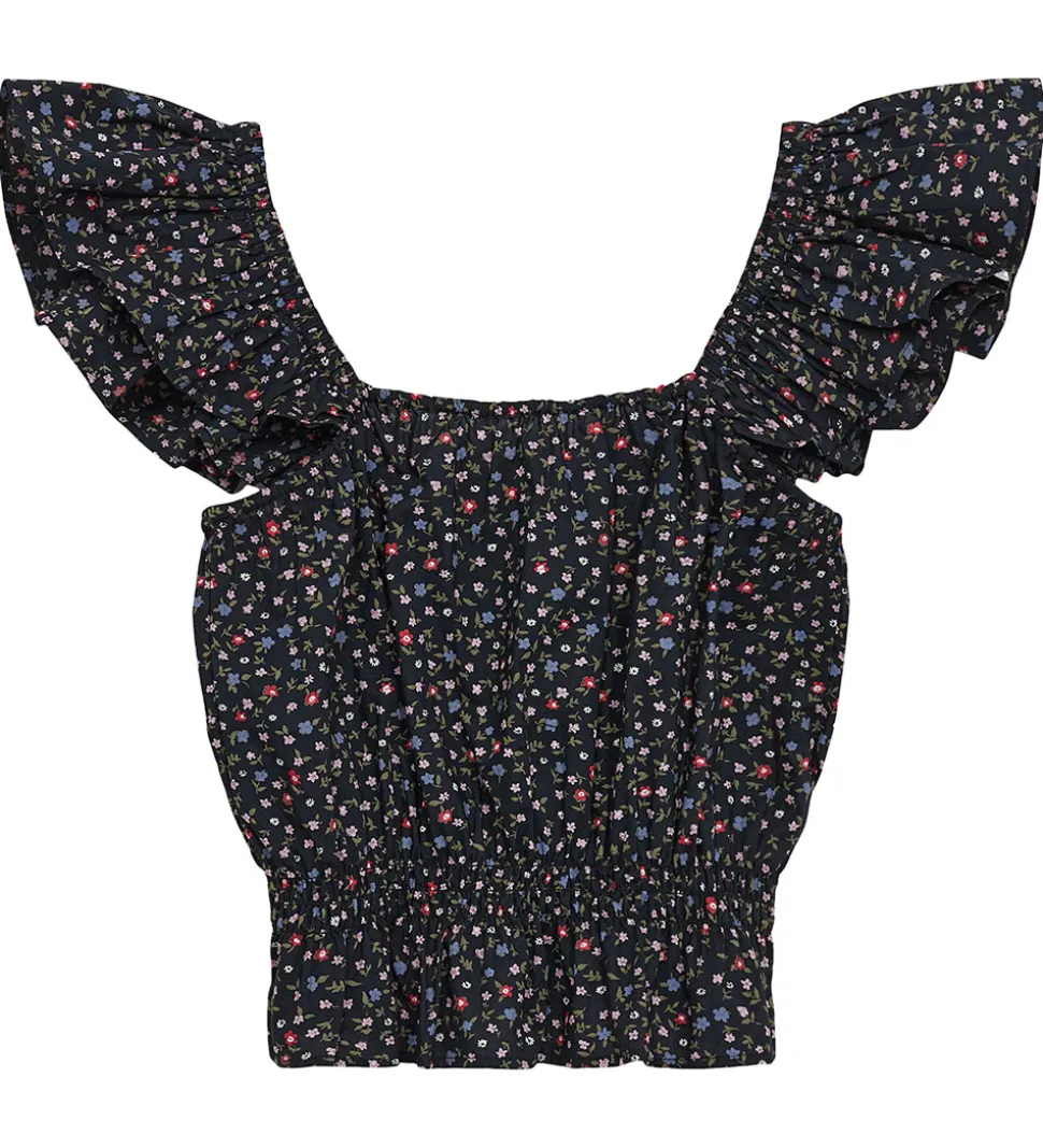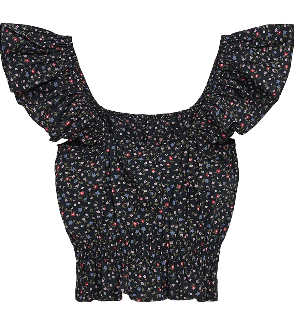 Designers Remix toppen er kort og har brede elastikker over skuldrene med skønne flæser, som giver et unikt look. Ved taljen er der en smal smock syning, hvor der også er en smal flæse i bunden.