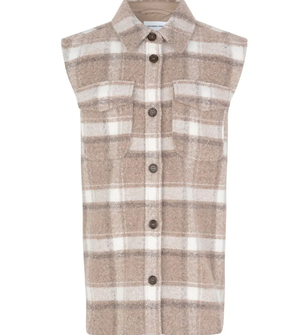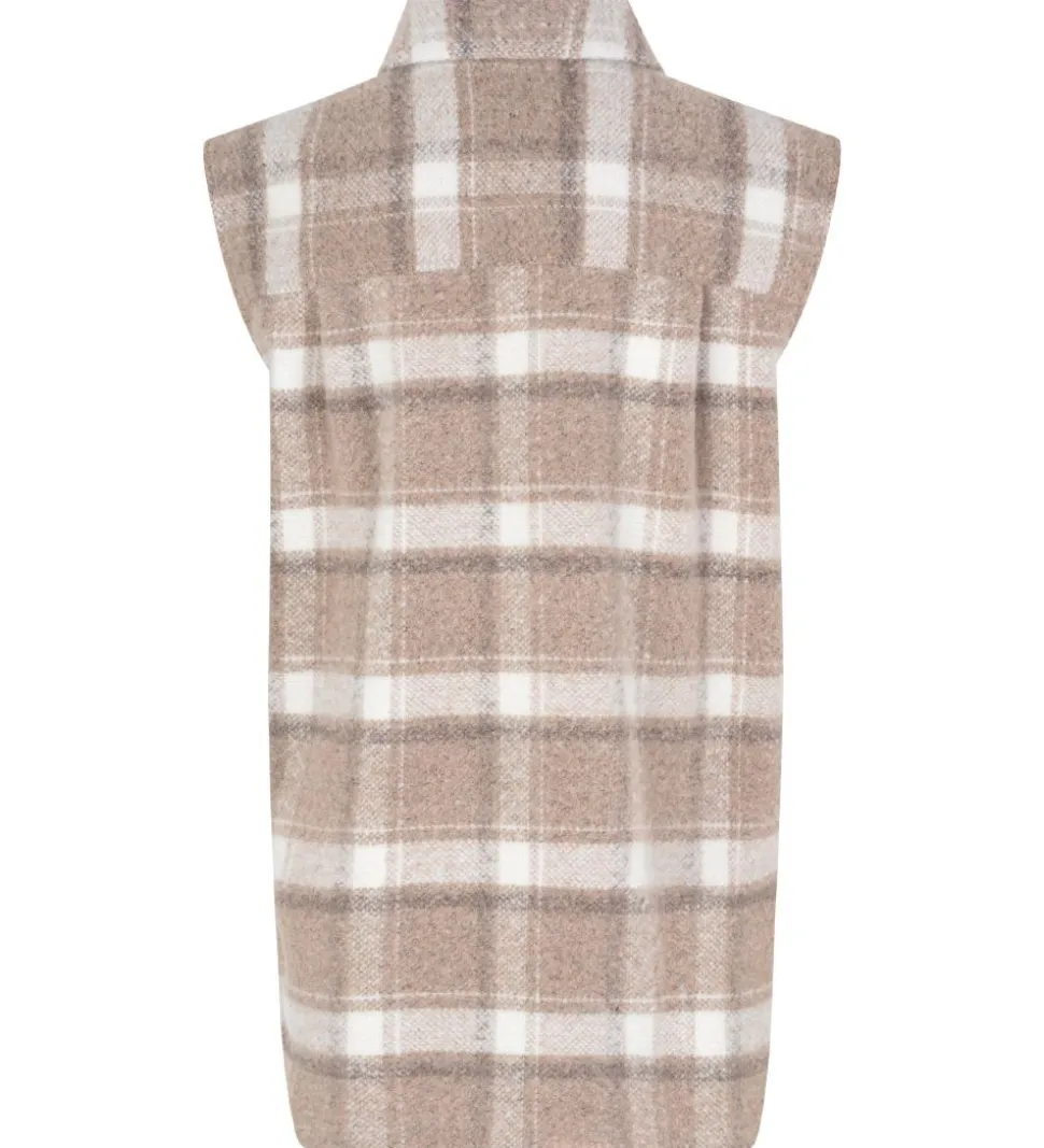 Fin Designers Remix vest med et ternet mønster i beige, hvid og brun.