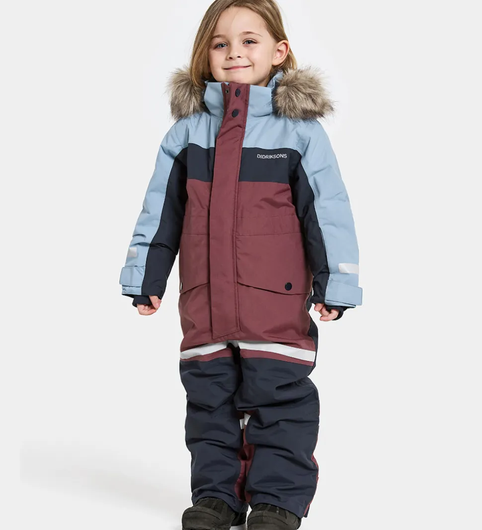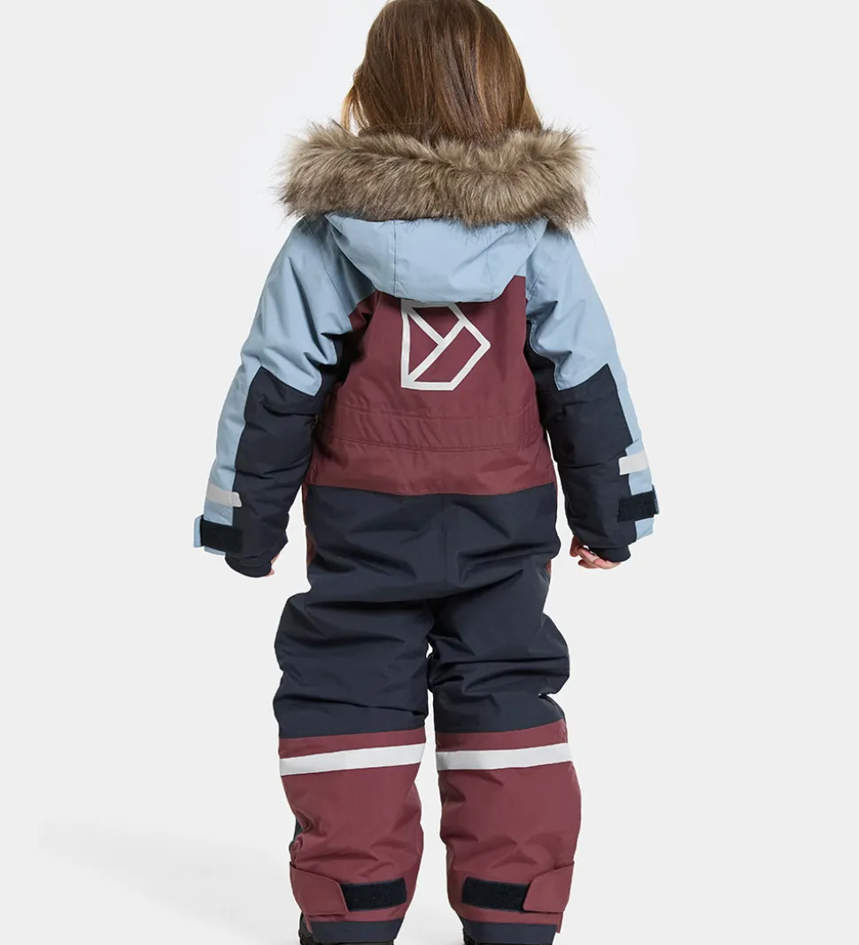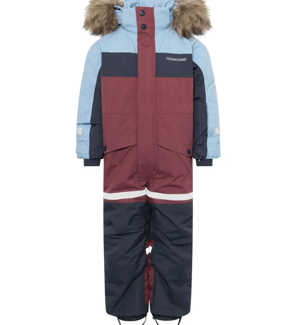 Flot Didriksons flyverdragt i mørk, støvet rød, lyseblå og navy og med et broderet, hvidt logo på venstre bryst. Flyverdragten har velplacerede, praktiske reflekser.