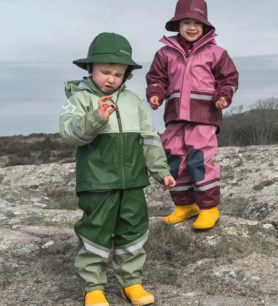 Smart Didriksons regntøj, der består af en regnjakke og et par regnbukser med seler i grønne nuancer. Regntøjet er lavet af PU.