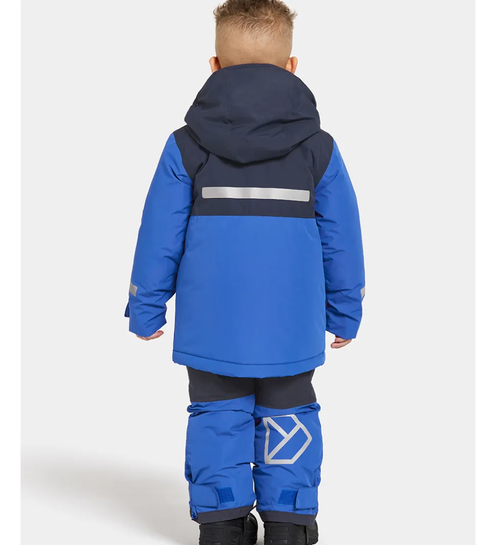 Herligt Didriksons skisæt, der består af en vinterjakke og et par skibukser i blå med navyblå indsatser. Skisættet har broderede logoer og refleksprint.