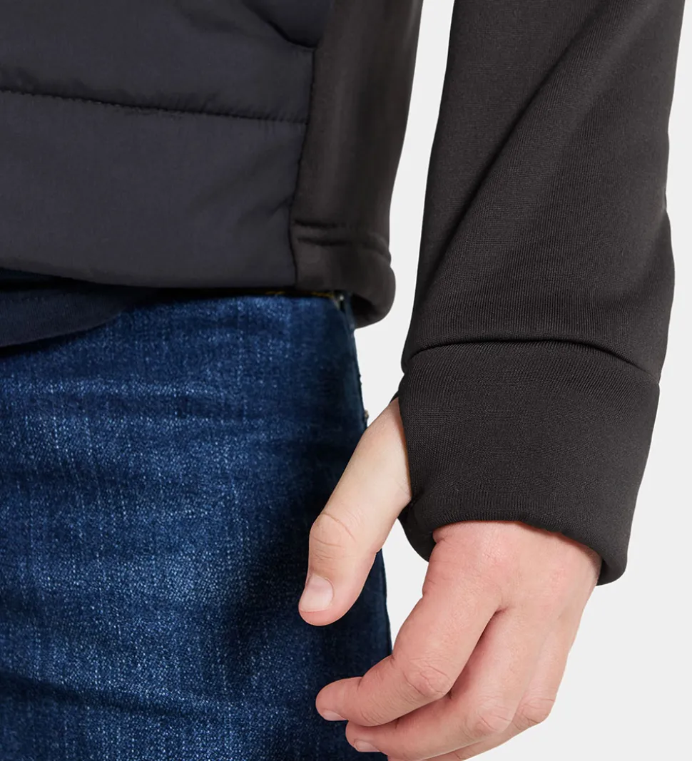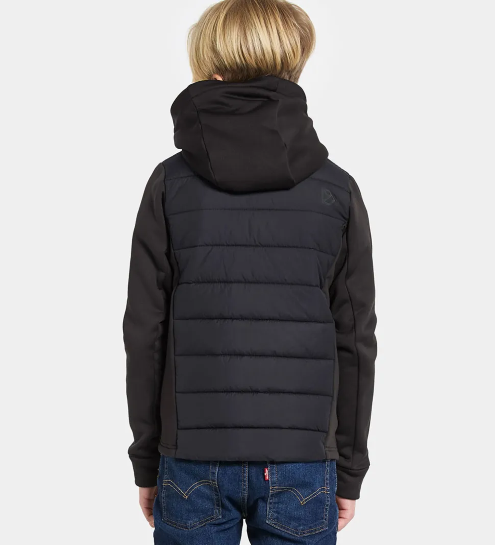 Fin Didriksons softshelljakke i sort. Kroppen er i et glatvævet materiale med vandrettte syninger, mens resten er i softshell.