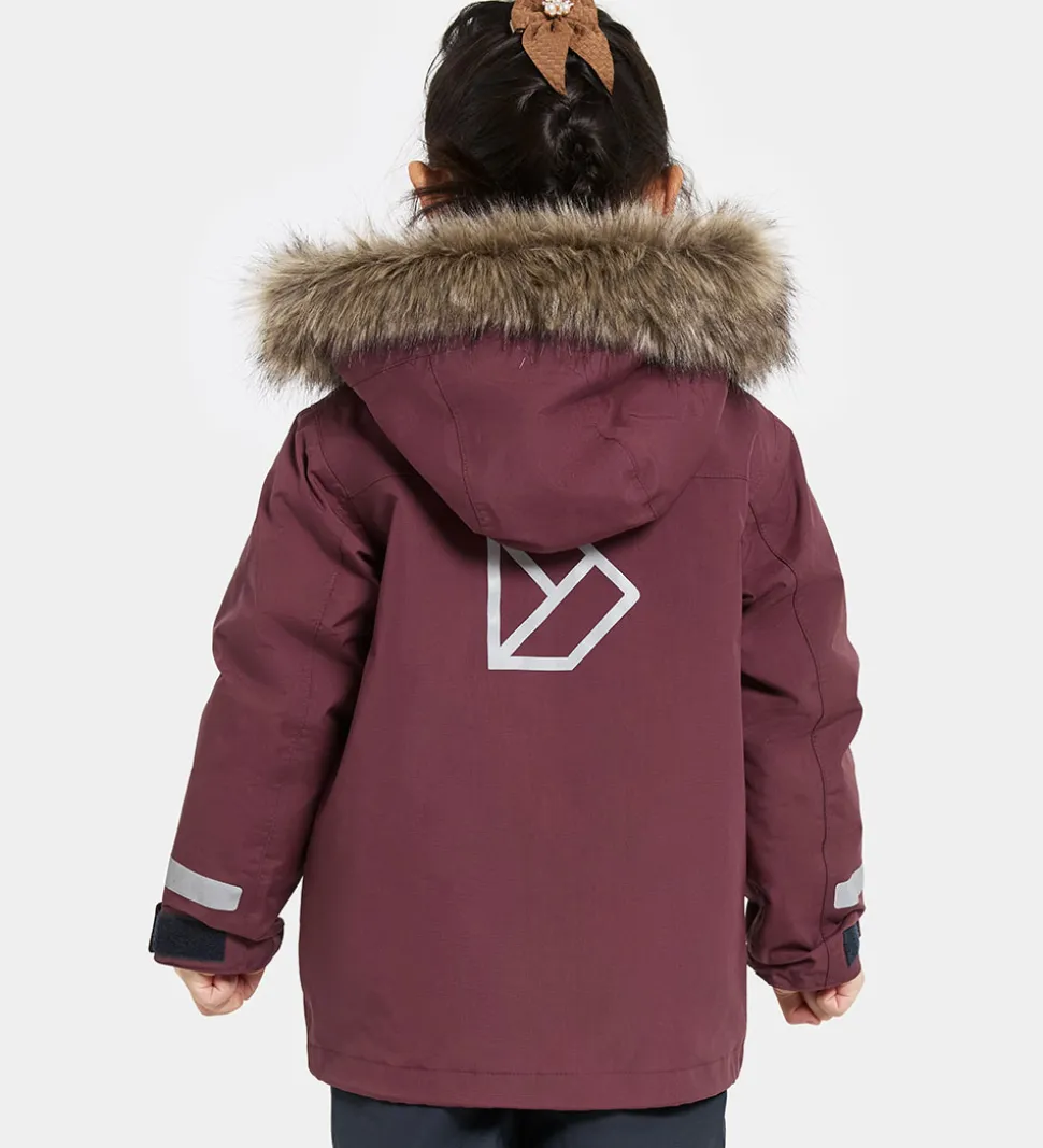 Sej Didriksons vinterjakke i mørk, støvet rød. Hætten har en flot kant af imiteret pels. Vinterjakken har praktiske reflekser yderst på ærmerne og et stort refleksprint på ryggen.