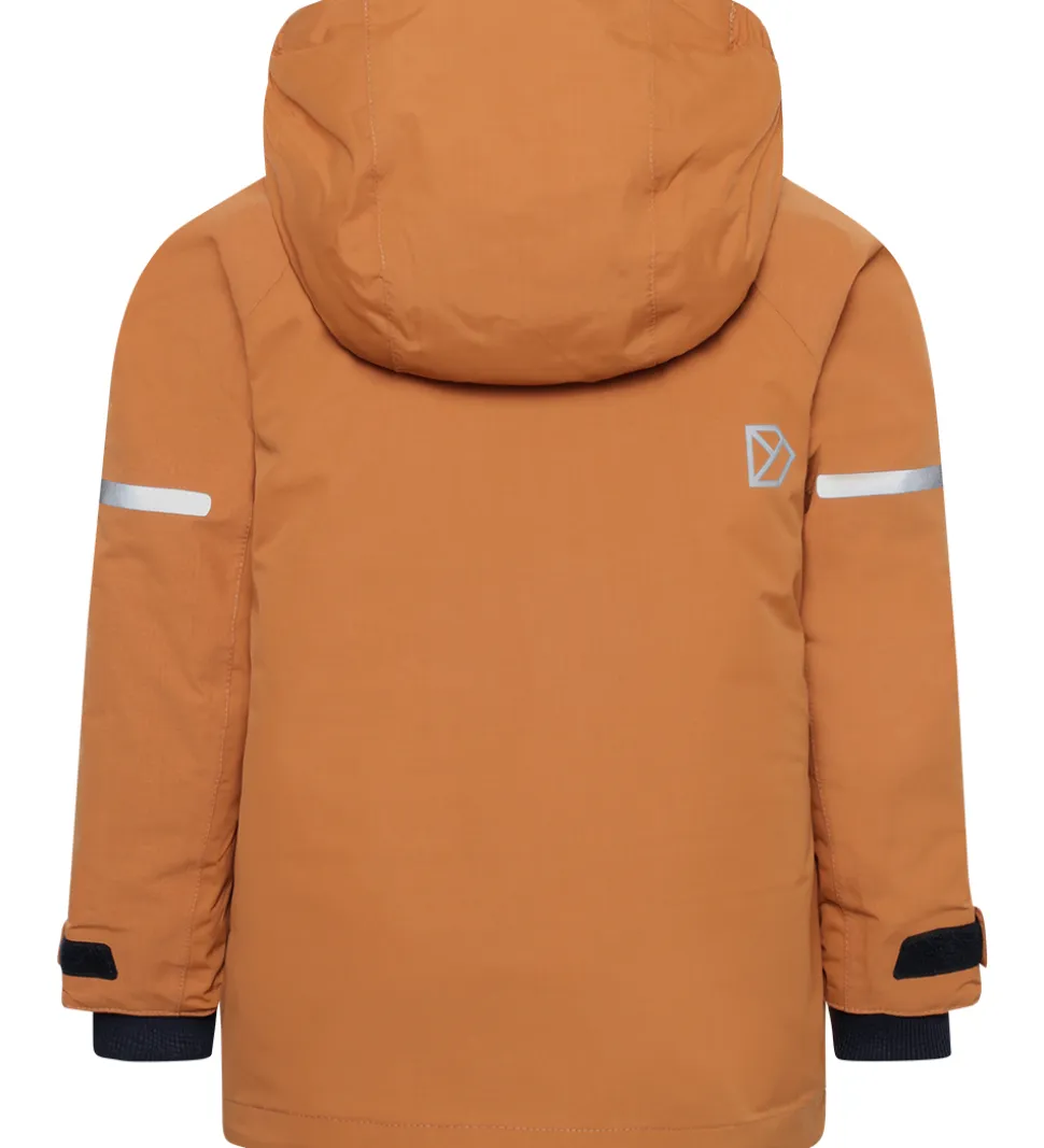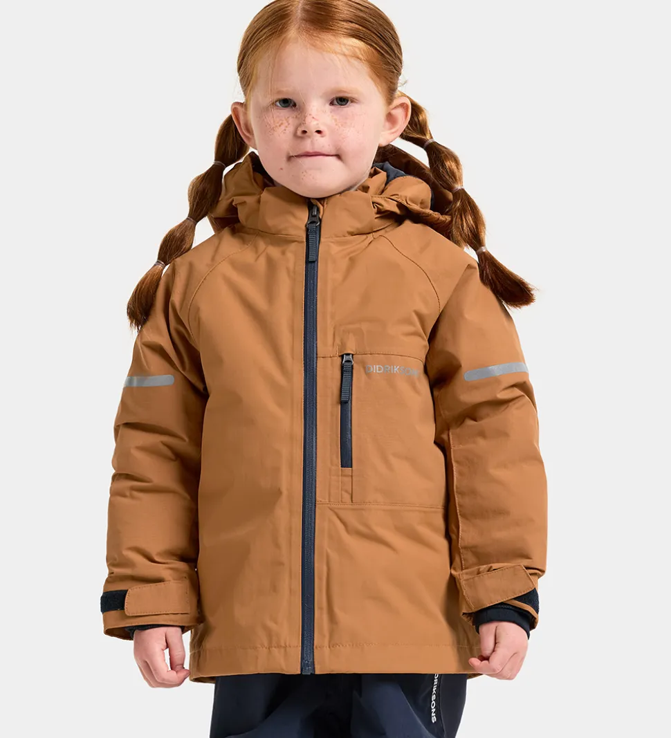 Smart Didriksons vinterjakke i mandelbrun. Vinterjakken er med logoer og refleksprint.